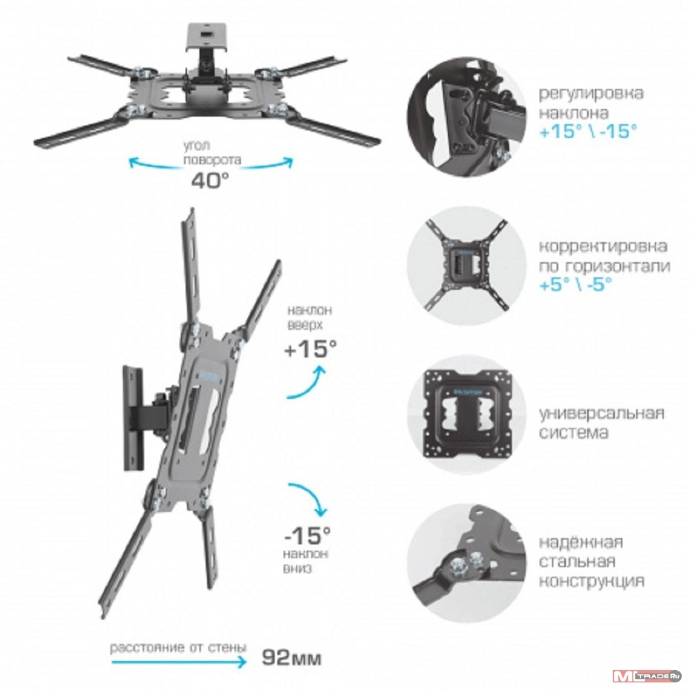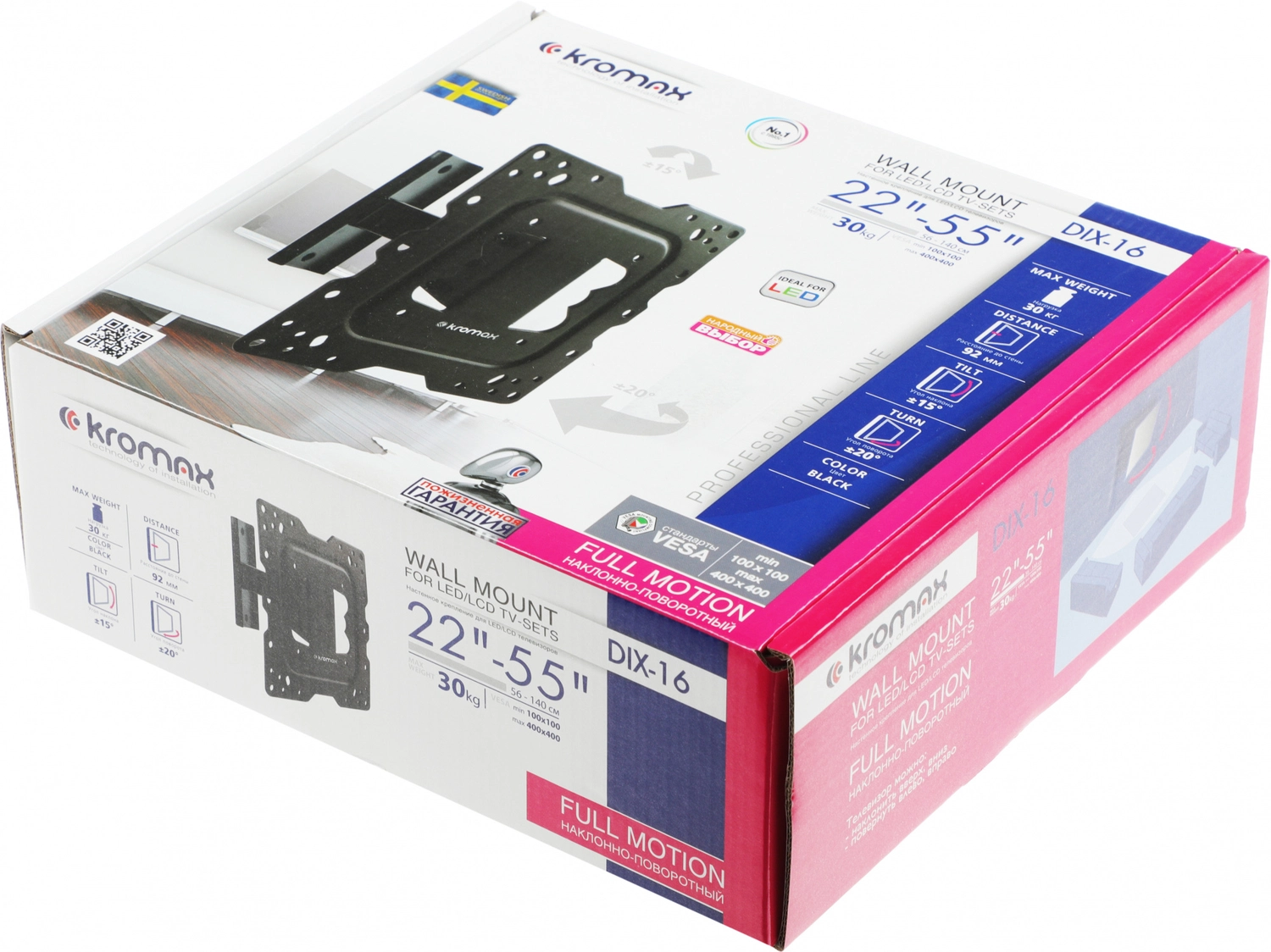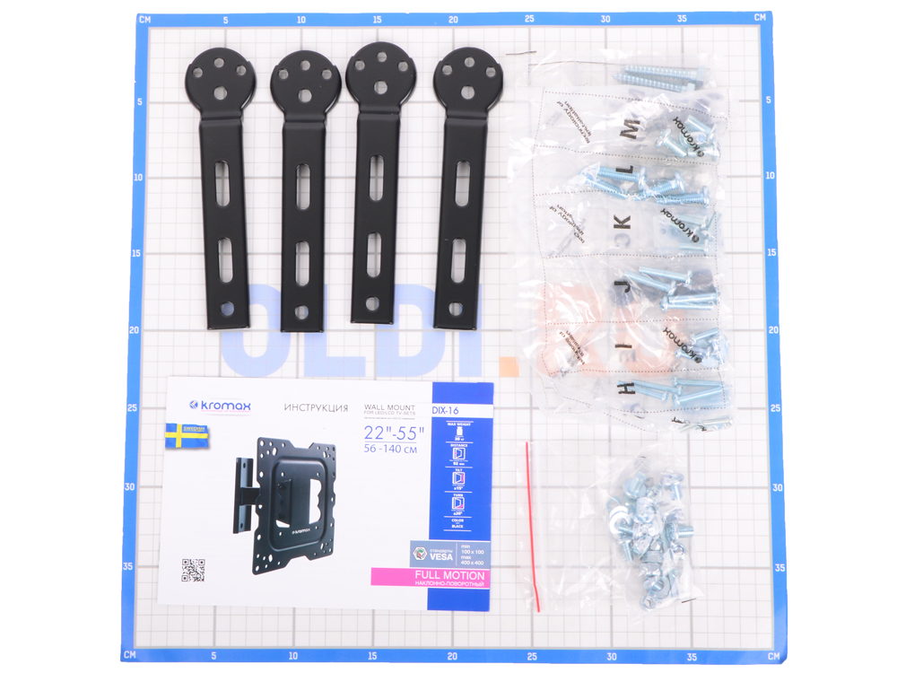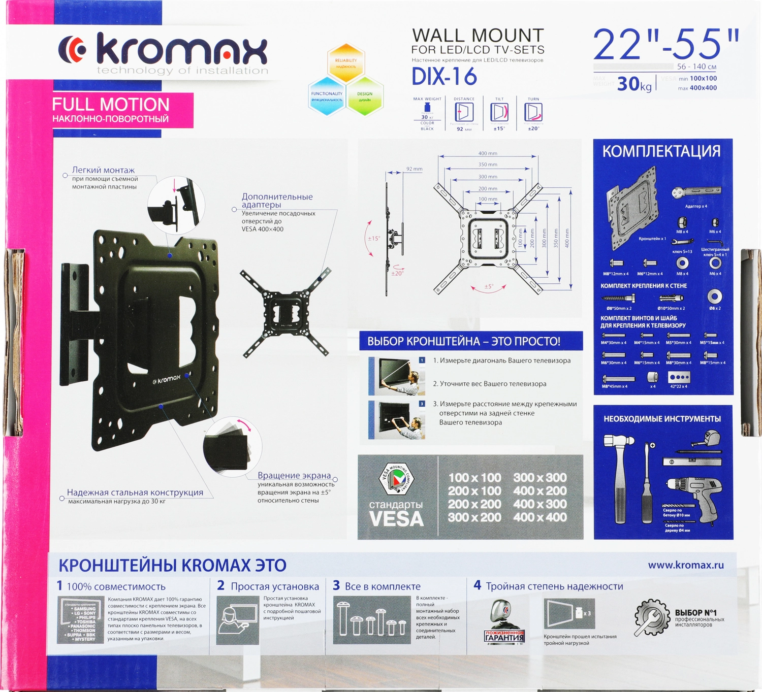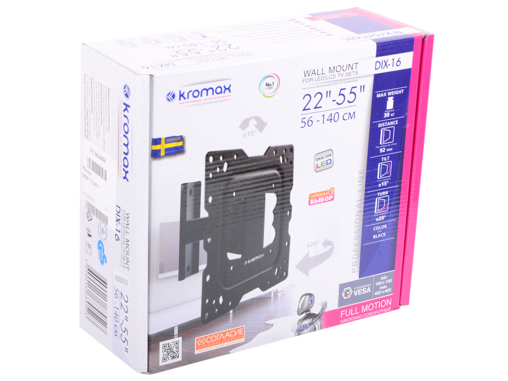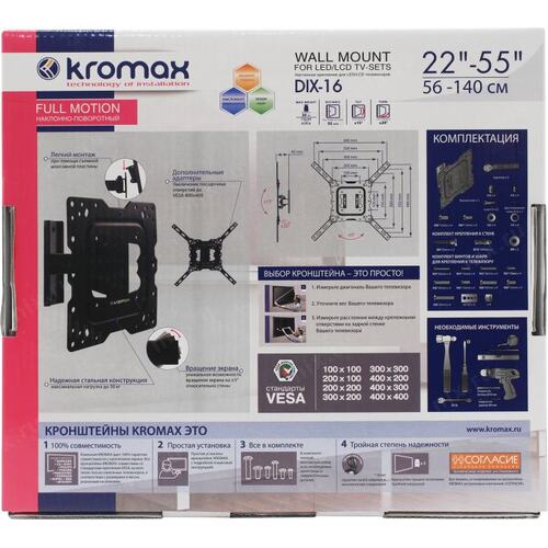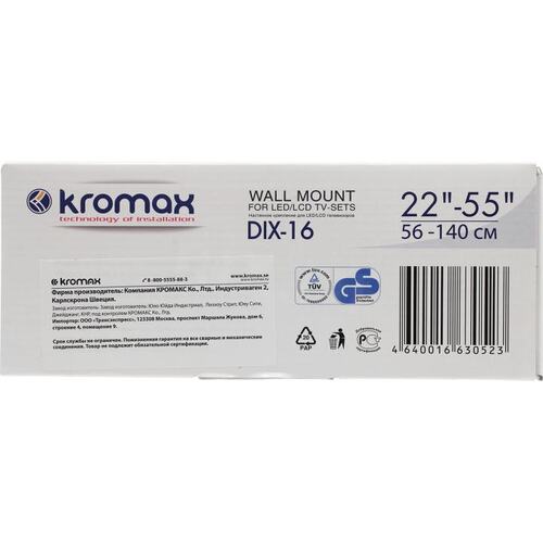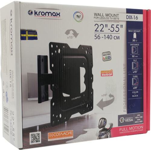 Крепеж Kromax DIX-16 black, Кр. стал. наст. для TV 22"-55", max 30 кг, 3 ст св., нак. ±15°, пов. ±20°, от ст. 92 мм, max VESA 400x400 мм. [DIX-16black] | НИКС Екатеринбург
