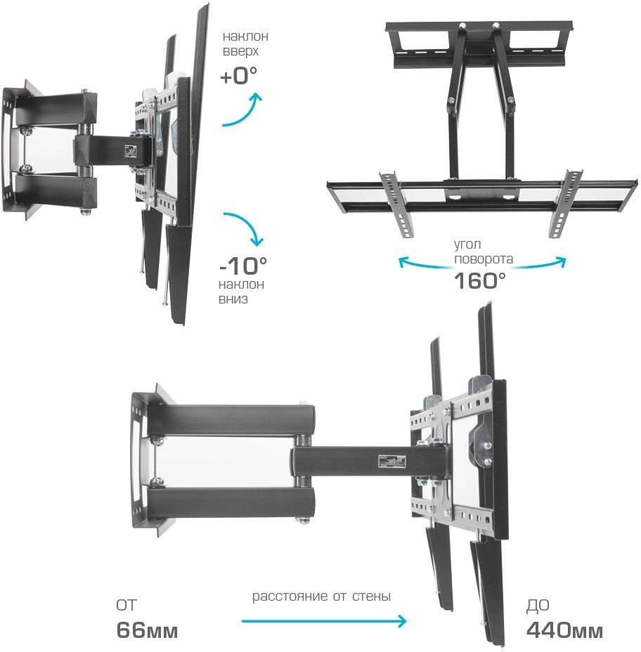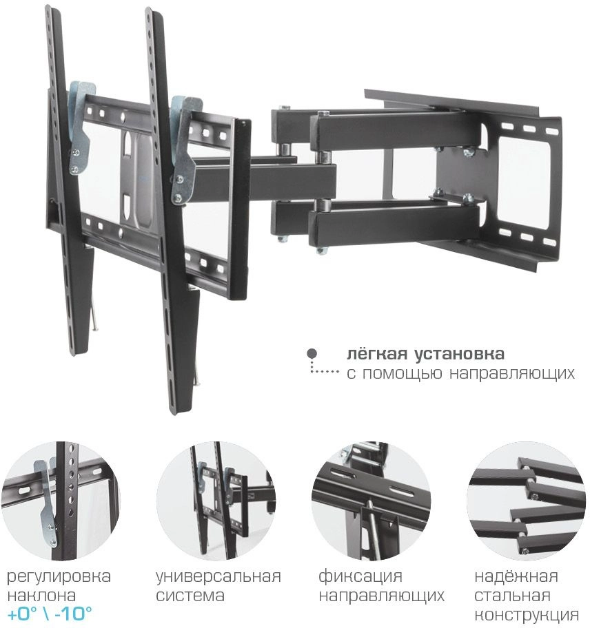 Универсальный - телевизор на кронштейне можно наклонить, повернуть и сдвинуть к стене, Легкий монтаж телевизора - благодаря наличию съемной монтажной пластины, Широкое настенное основание, Надежная стальная конструкция максимальная нагрузка до 45 кг, Водяной уровень