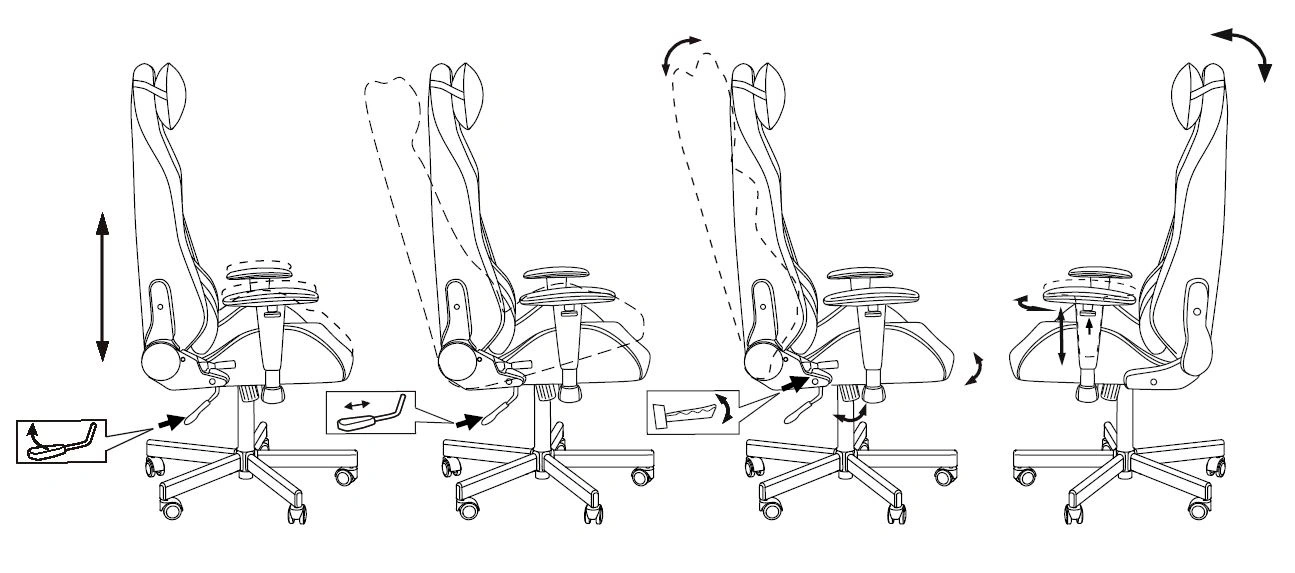 высоты (газлифт) , высоты подголовника, жесткости качания, положения подлокотников