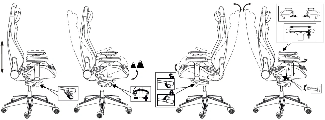 высоты (газлифт) , высоты подголовника, высоты подлокотников, наклона спинки, положения подлокотников