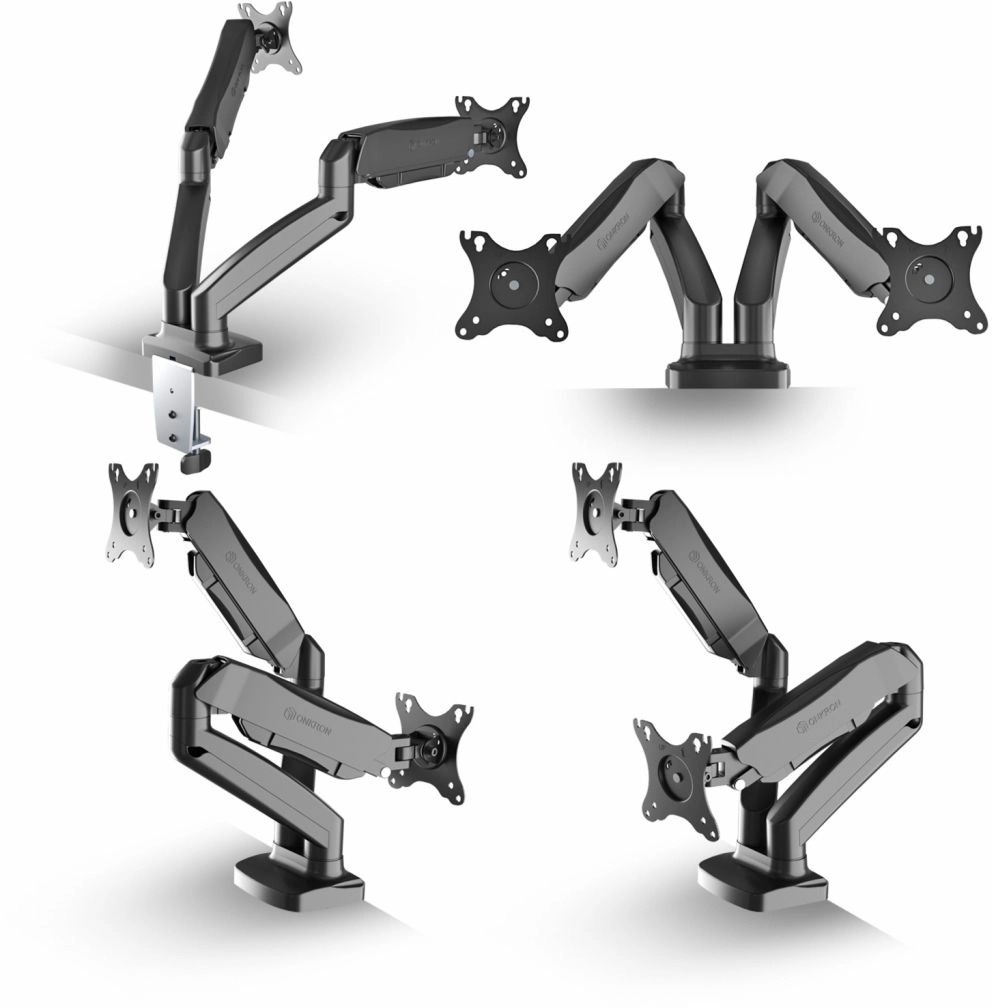 Для двух мониторов. Настольный наклонно-поворотный. Газлифт. Регулировка высоты от 170 до 410мм. Крепление при помощи струбцины на край стола или винтом ч-з отверстие