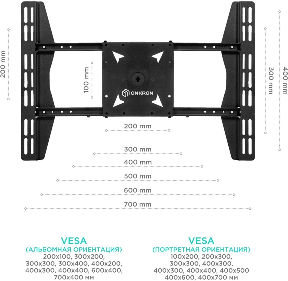 Различные варианты крепления VESA. Регулируемый вылет от потолка. Регулировка вылета VESA-панели. Альбомная и портретная ориентация. Широкие возможности регулировки.