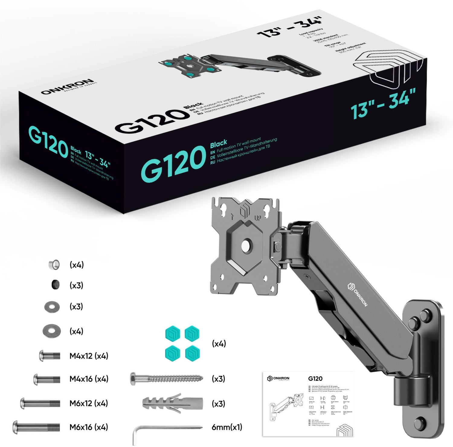 Настенный наклонно-поворотный кронштейн для монитора, выполненный по технологии газлифт, ONKRON G120 подходит для мониторов и телевизоров диагональю от 13 до 34 дюймов и весом от 1 до 8 кг.