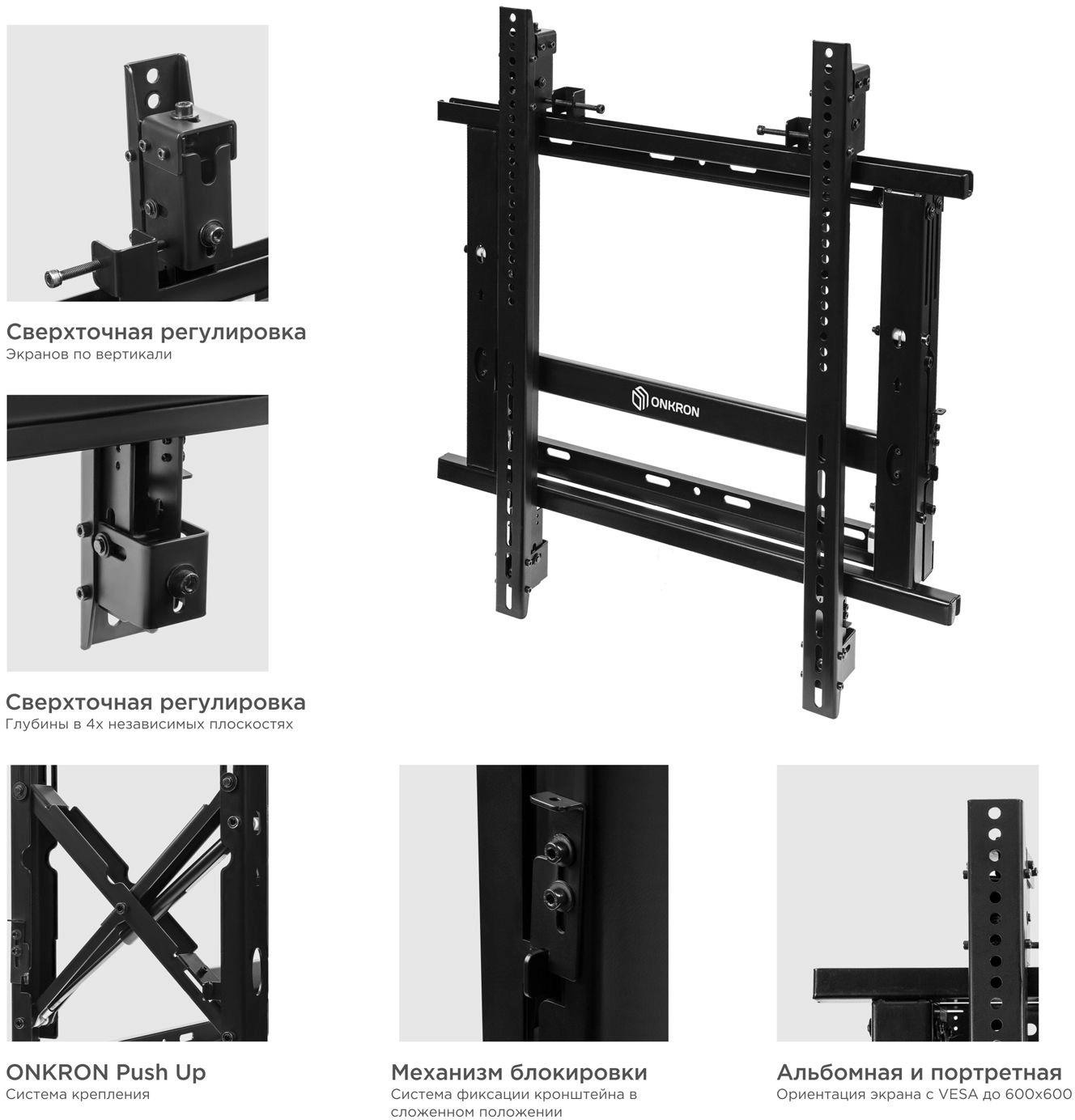 Сверхточная регулировка. ONKRON Push Up. Механизм блокировки. Портретная и альбомная ориентация.