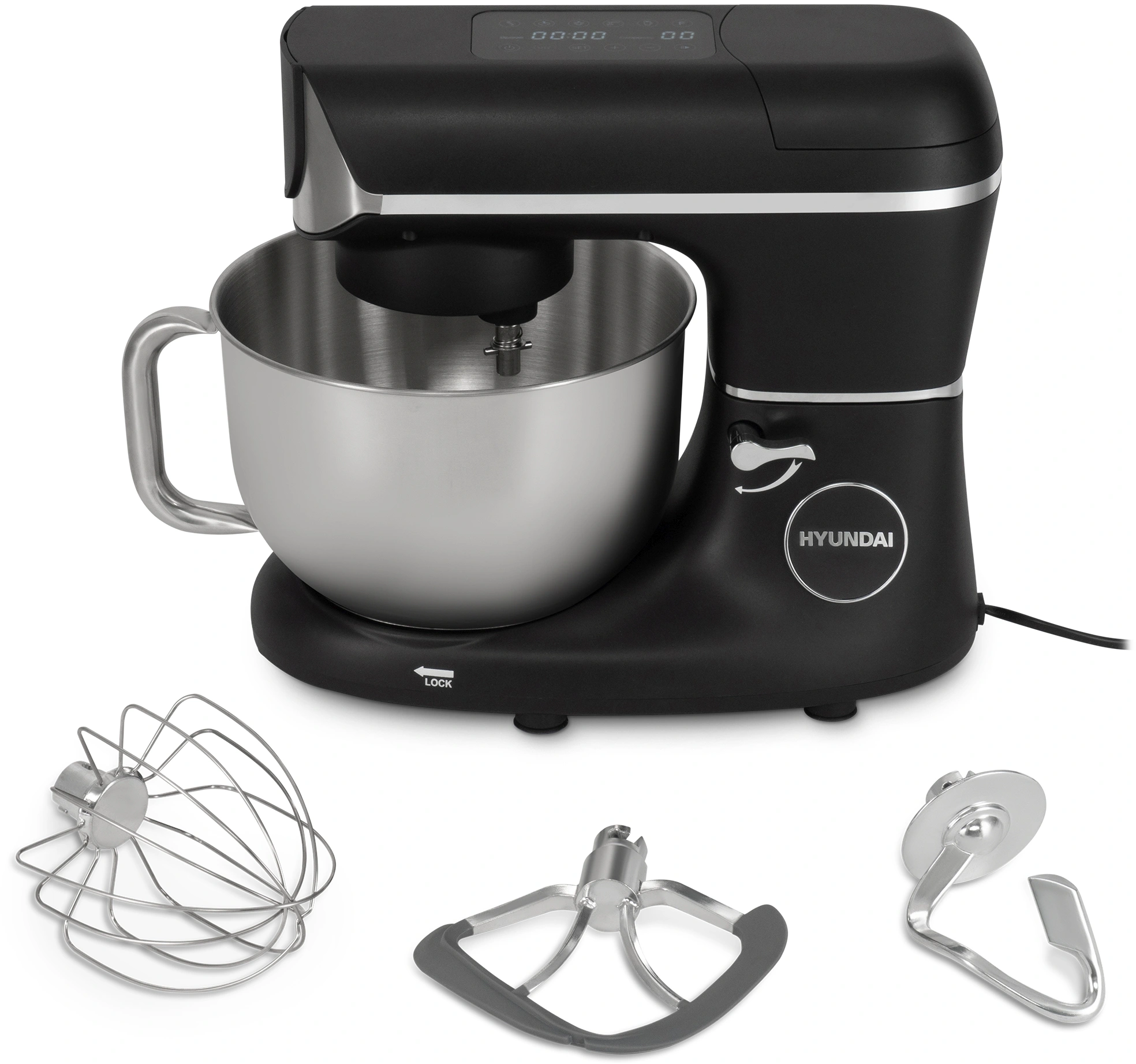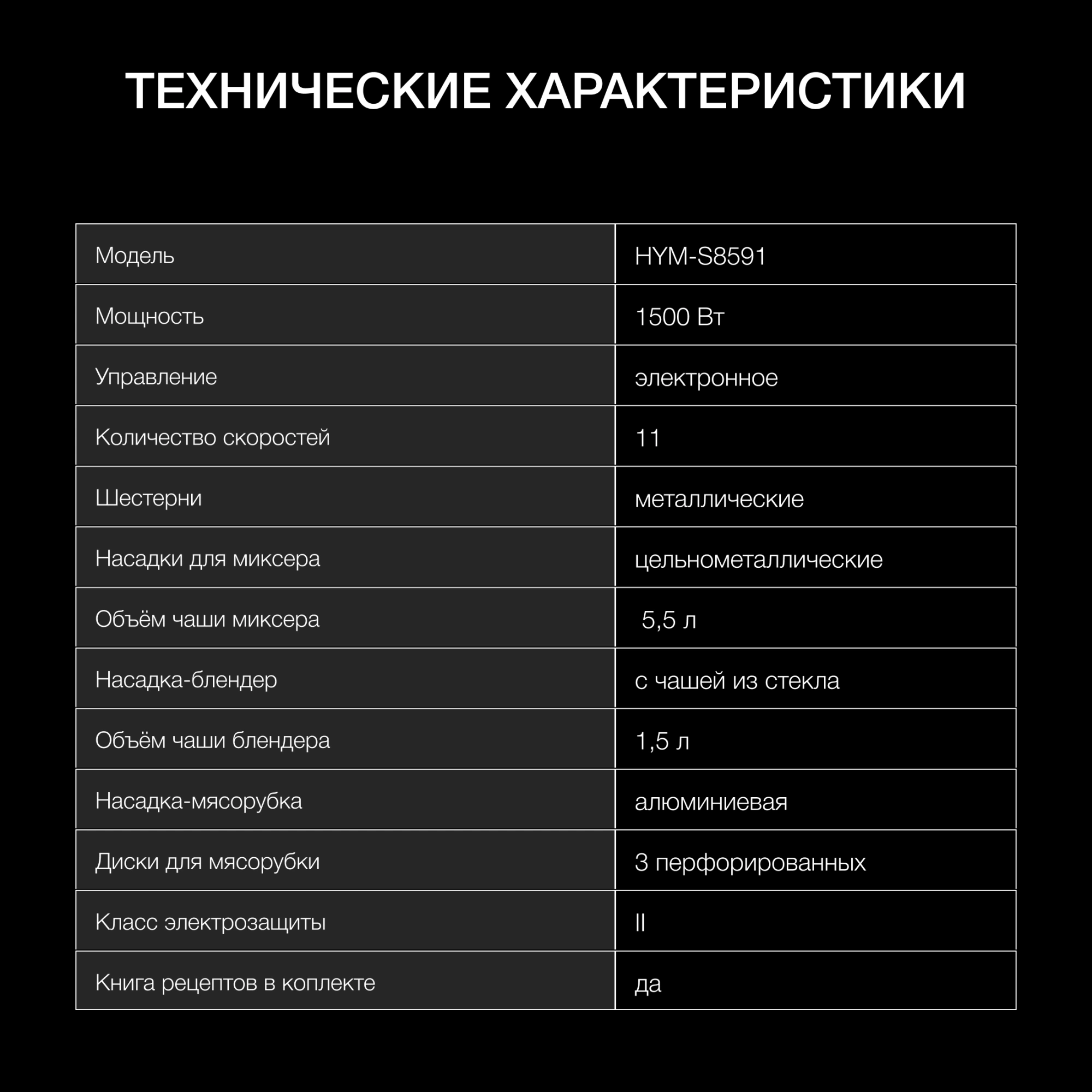 кухонная машина; чаша; защитная крышка для чаши; насадка-венчик; насадка-крюк; насадка-лопатка; насадка-блендер; насадка-мясорубка; 3 диска для фраша; книга рецептов; инструкция с гарантийным талоном