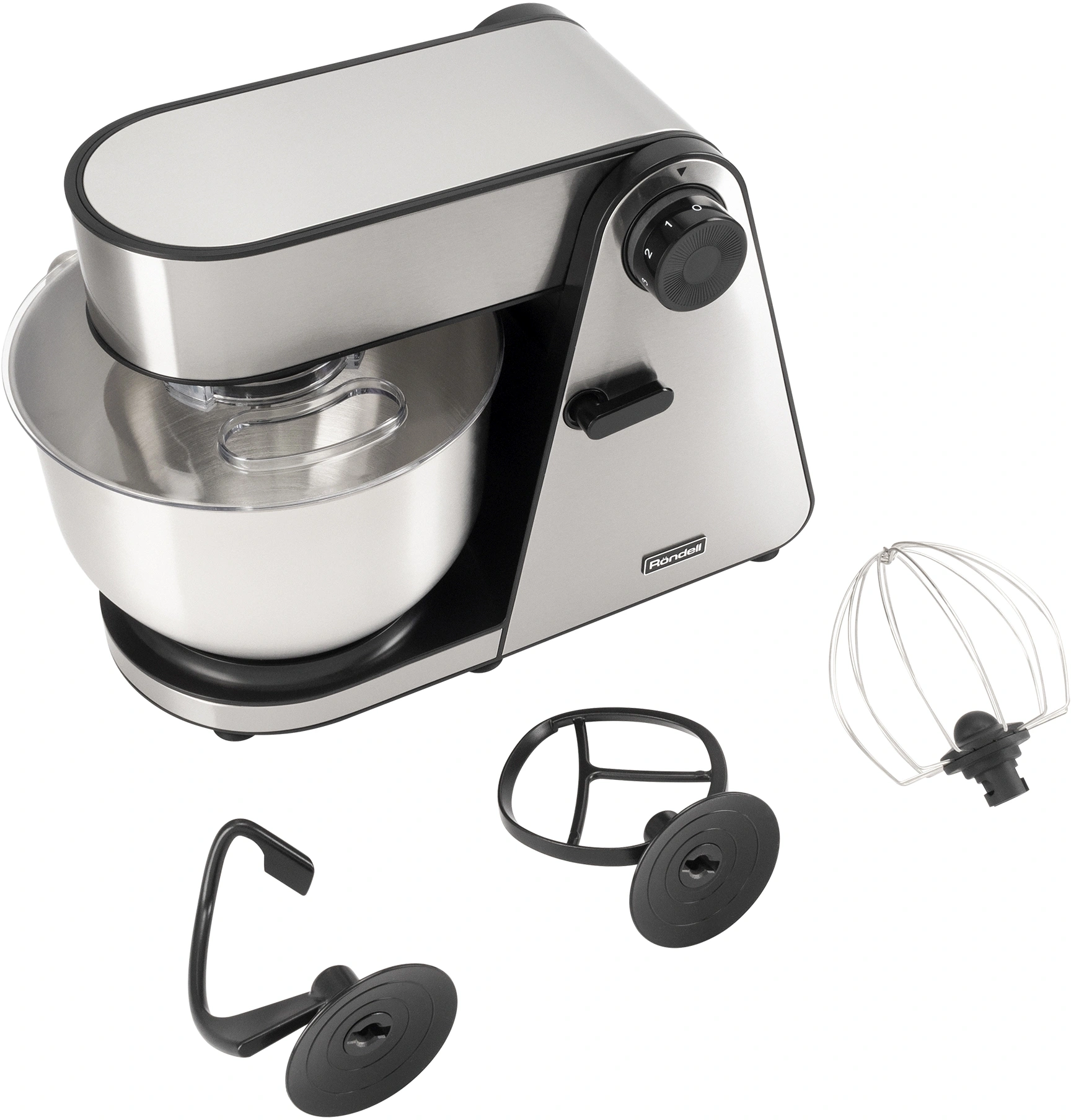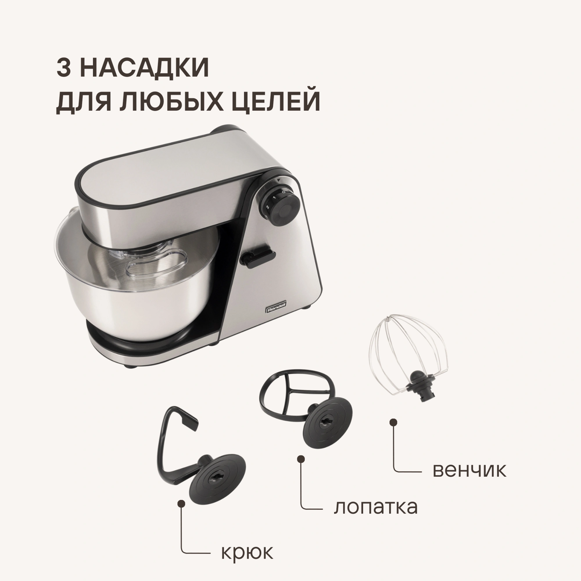 Миксер; защитный обод для чаши; чаша; 3 насадки; кулинарная силиконовая лопатка; книга рецептов; мануал с гарантийным талоном