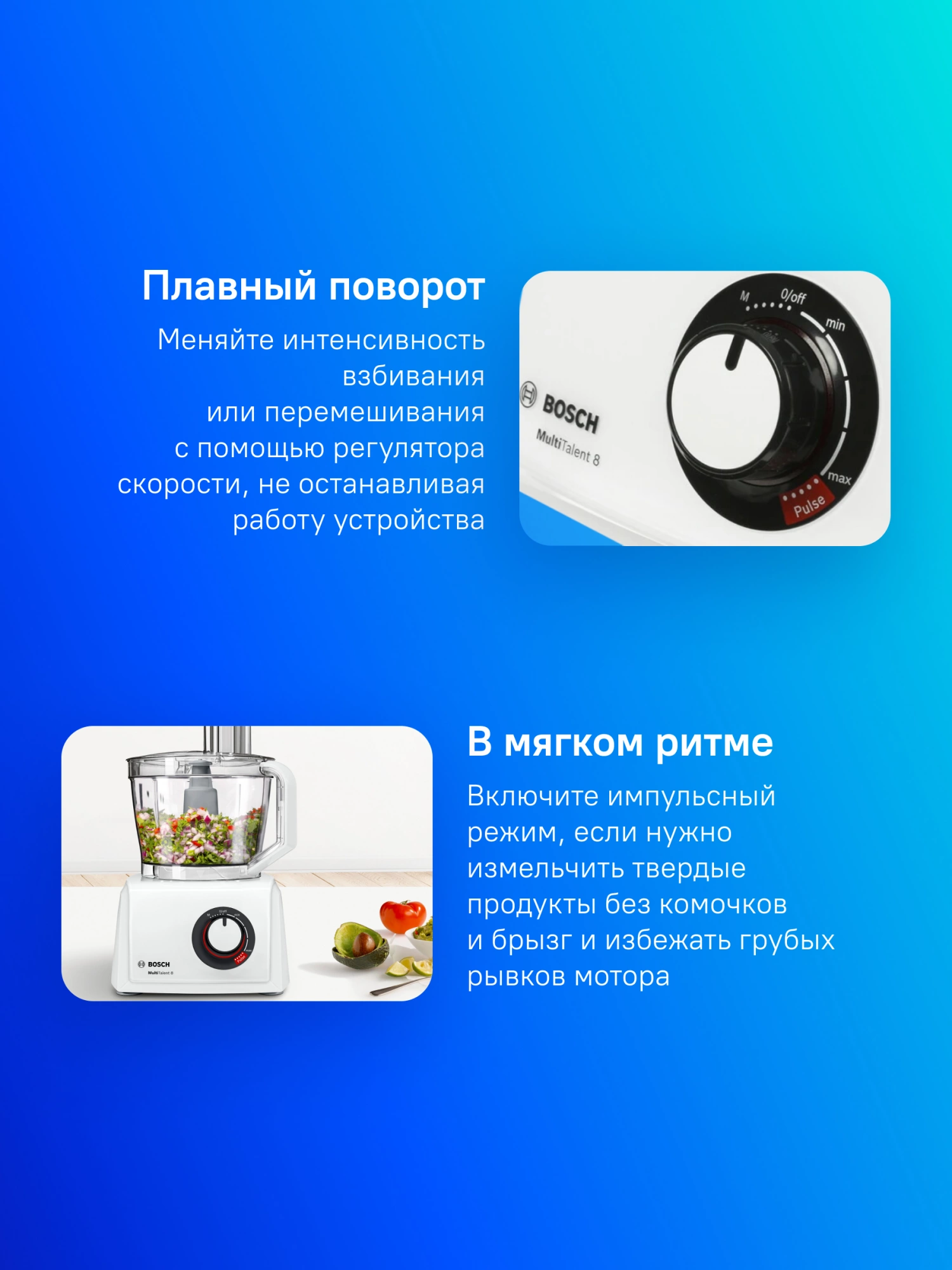 Двухсторонний диск - шинковка (крупная/ мелкая) , двухсторонний диск - терка (крупная/ мелкая) . Держатель дисков. Насадка для замеса теста (пластик) . Венчик из нерж. стали для взбивания крема, яичных белков и легкого теста. Пресс для приготовления сока из цитрусовых.