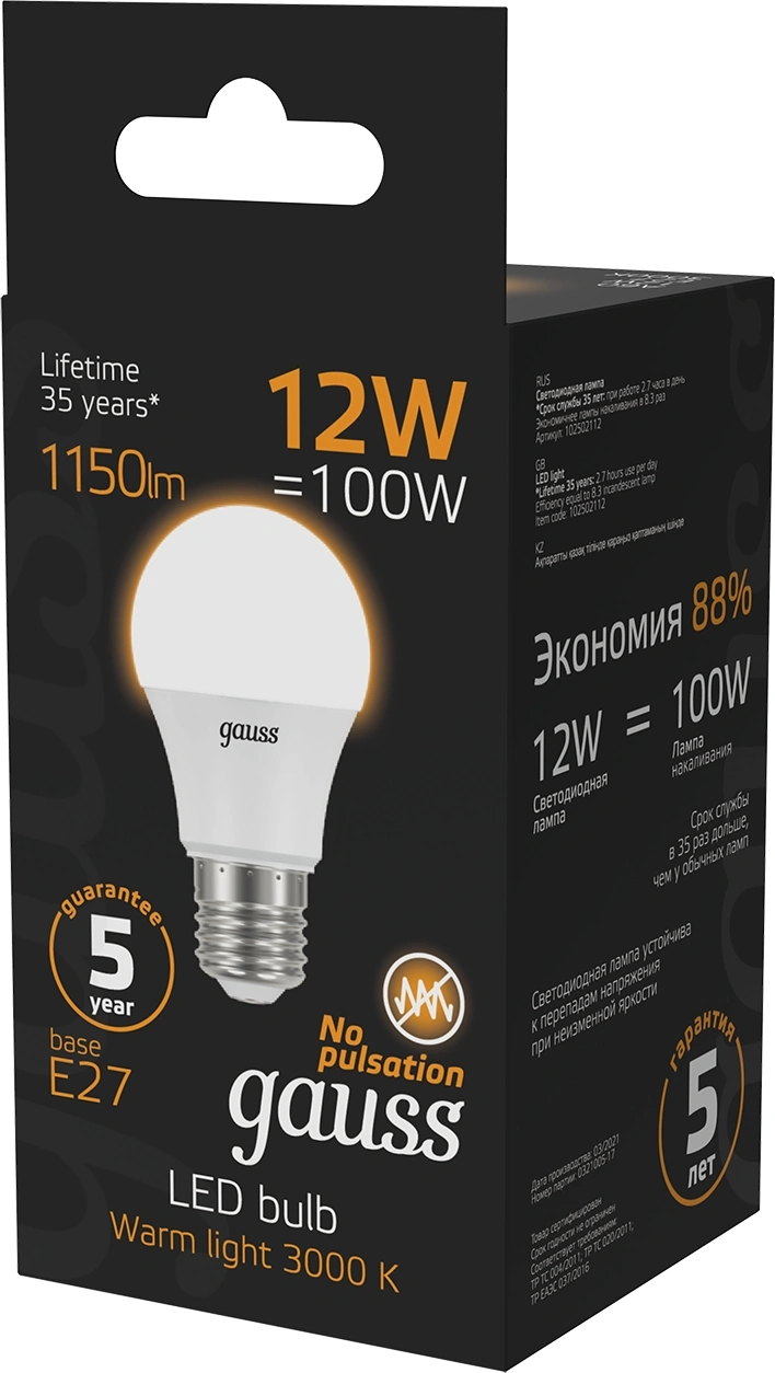 Светодиодная лампа Gauss - самый безопасный для здоровья и окружающей среды источник света. Она не пульсирует, мгновенно включается, не содержит ртути, и имеет больший срок службы, чем лампы накаливания и КЛЛ.