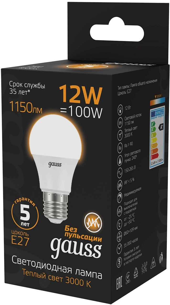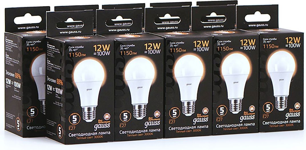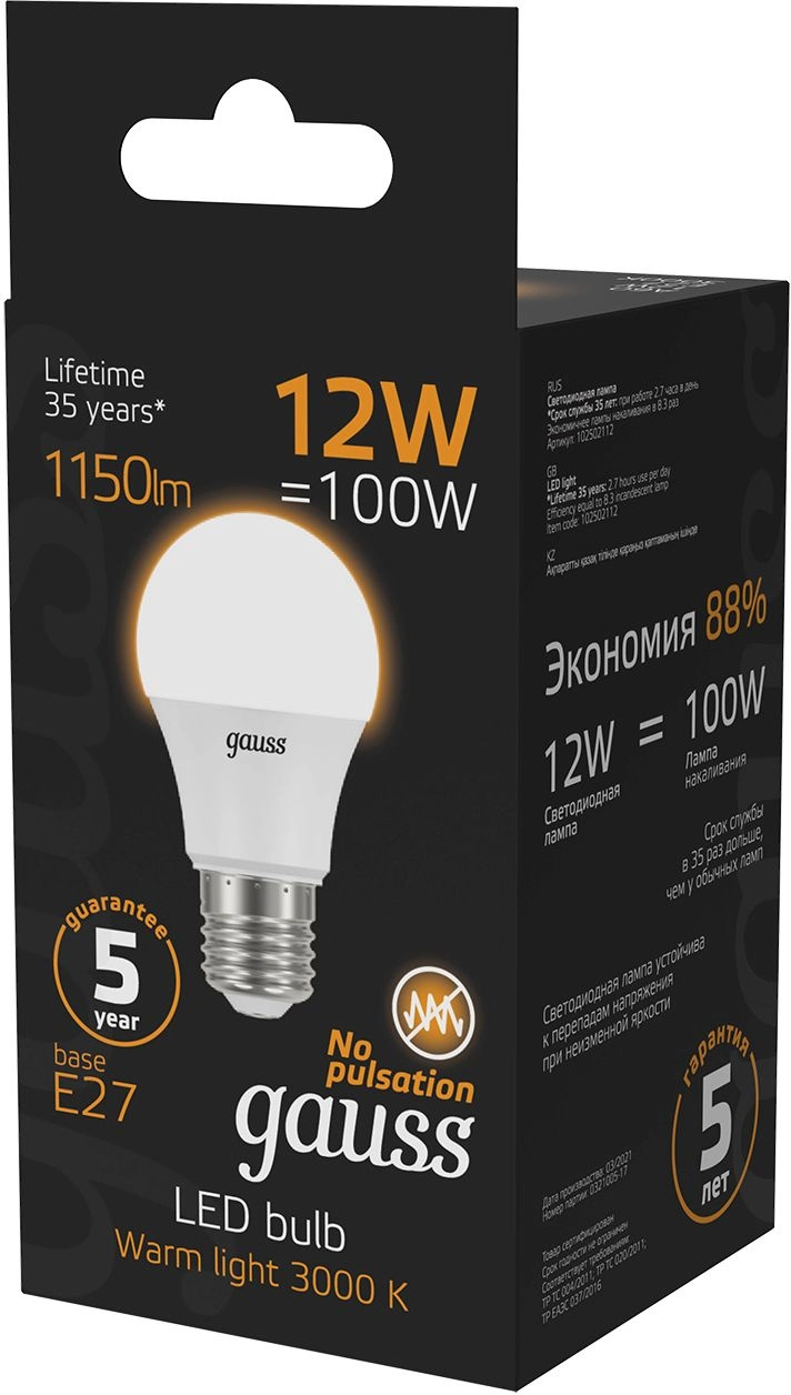 Лампа светодиодная Gauss A60 12Вт цок.:E27 шар 220B св.свеч.бел.теп. A60 (упак.:10шт) (102502112)