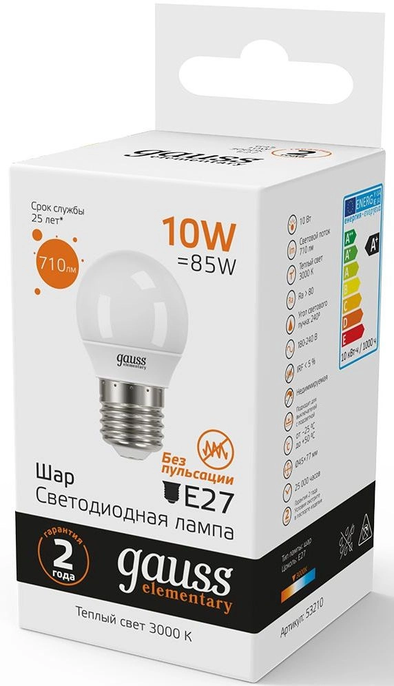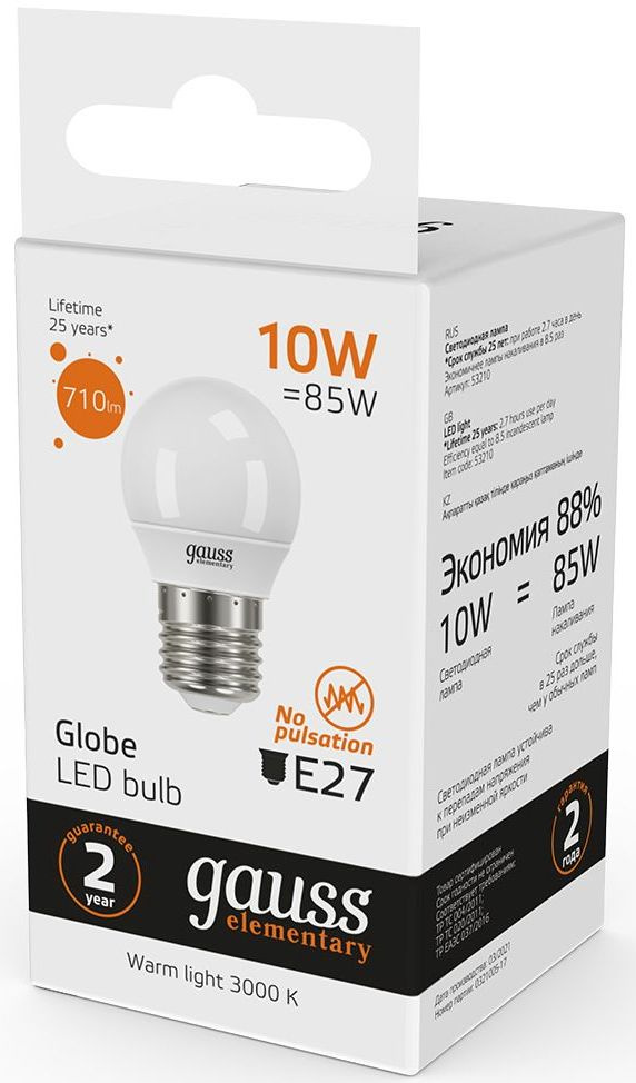 Светодиодная лампа Gauss - безопасный для здоровья и окружающей среды источник света. Она не пульсирует, мгновенно включается, не содержит ртути и имеет больший срок службы, чем лампы накаливания и КЛЛ, экономичнее ламп накаливания до 10 раз.