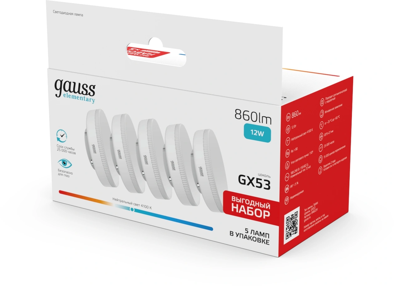 Лампа светодиодная Gauss Elementary 12Вт цок.:GX53 таблетка 220B св.свеч.бел.хол. (упак.:5шт) (84822V)