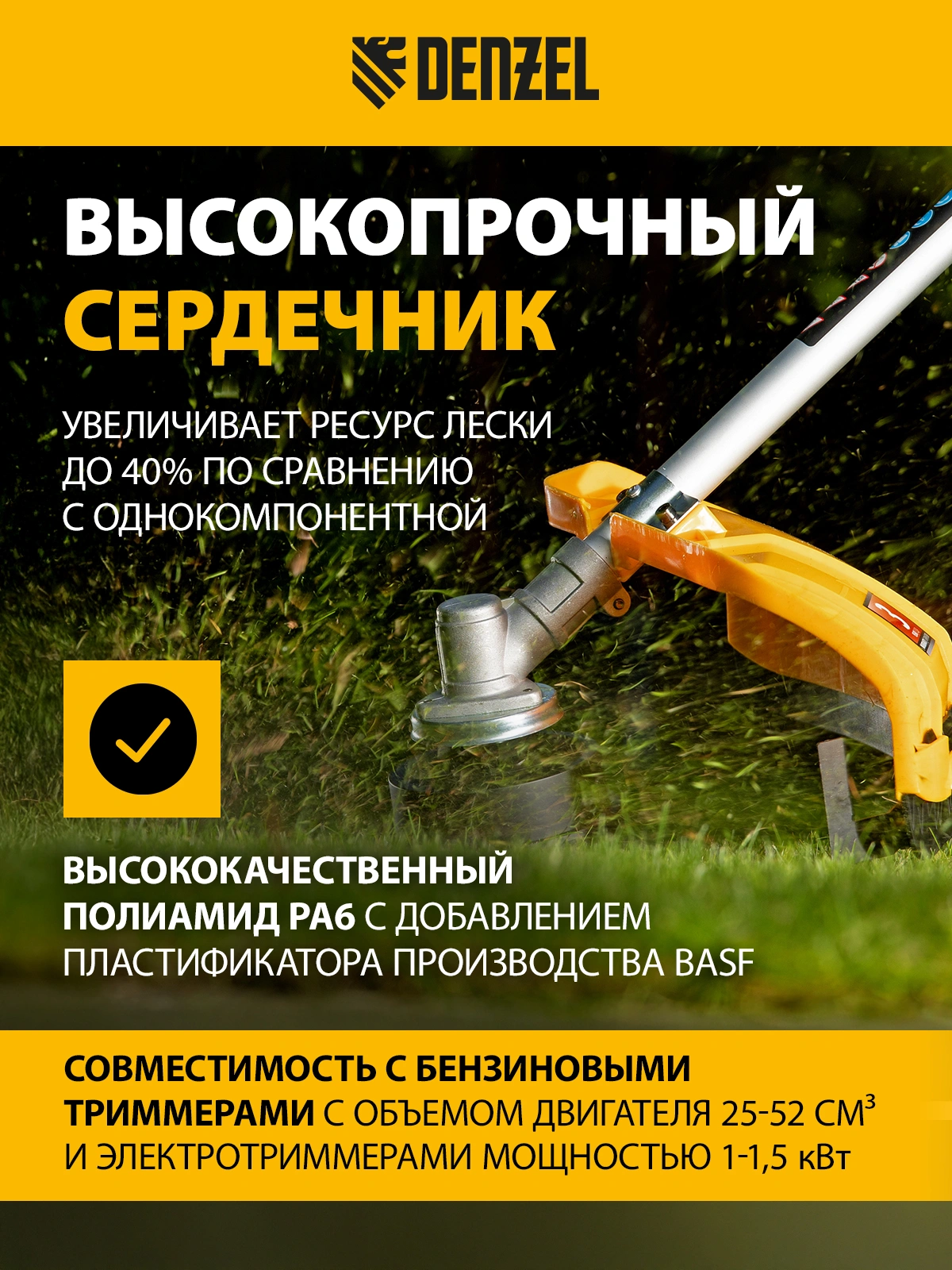 Леска для триммера 4, 0 мм Denzel арт 96826 EXTRA CORD предназначена для скашивания крупностеблевой растительности и эффективна для использования на замусоренной территории, мелких кустарников и сорняков.