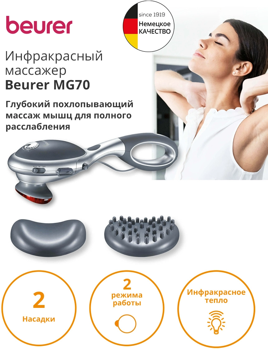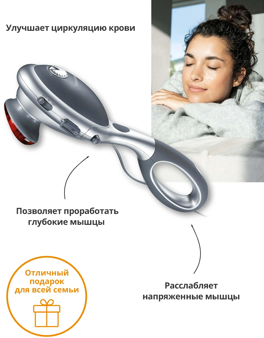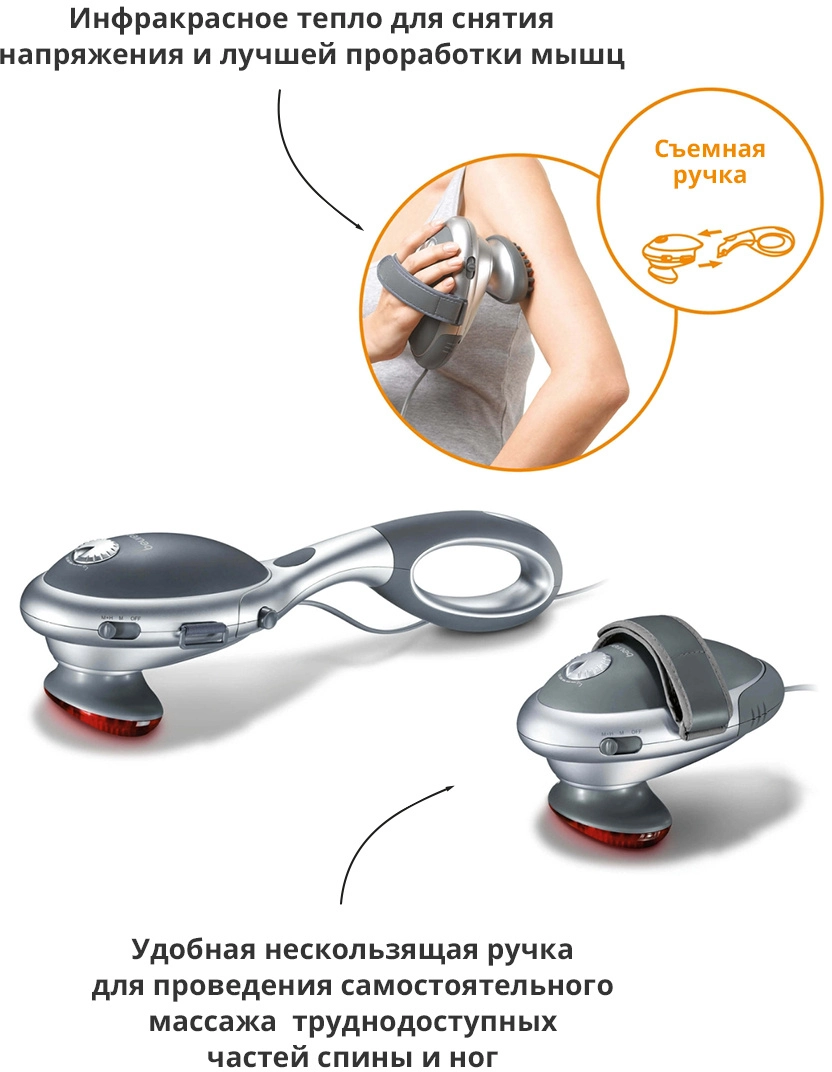 Универсальный массажер для тела. Великолепное сочетание похлопывающего массажа с регулируемой силой интенсивности и инфракрасного прогрева. В комплектацию входят 2 сменные массажные насадки, одна из которых предназначена для деликатного массажа, а другая отлично подойдет для глубокого разогревающего