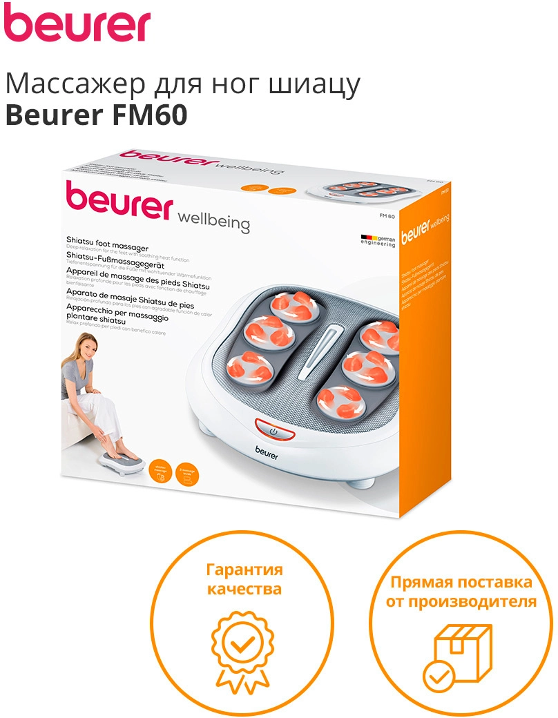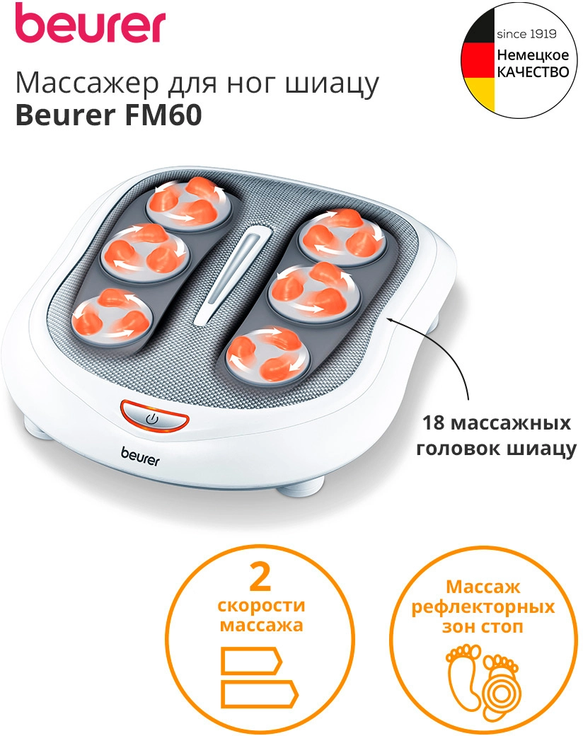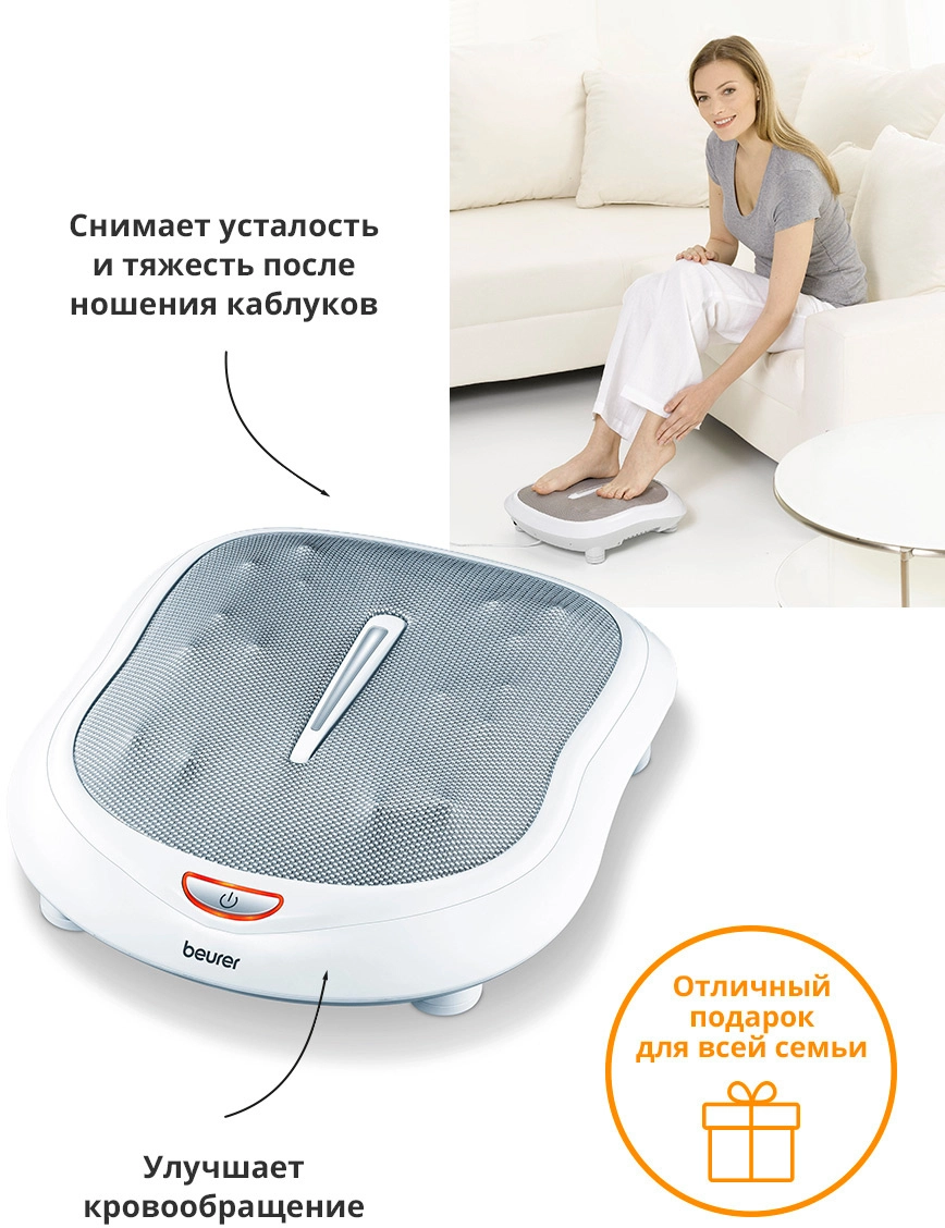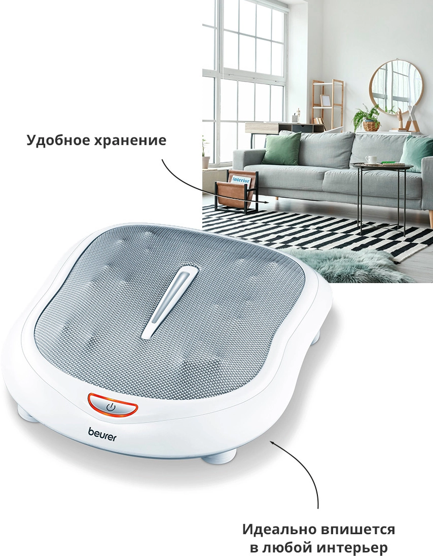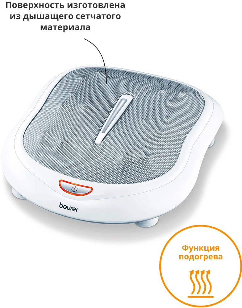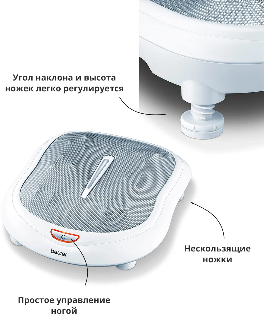 Индивидуально настраиваемый угол наклона благодаря ножкам с регулировкой по высоте. Расслабляющий массаж ног в технике шиацу с 18 массажными головками (3x3 на поверхность ступни) . Цветной светодиод на кнопке для индикации функций. Приятная поверхность из «дышащей» сетки.