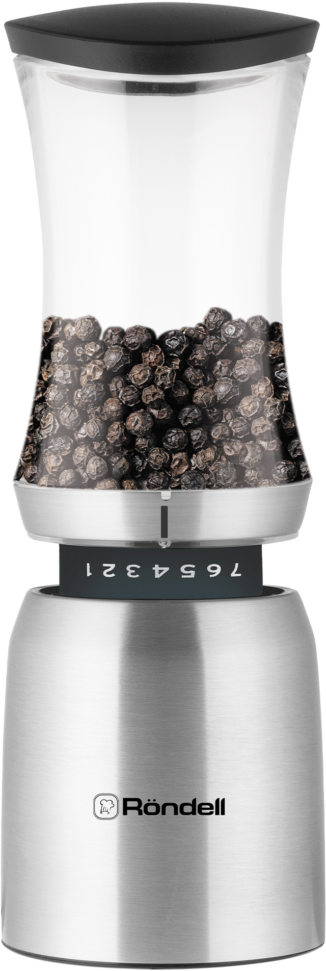 Материал: акрил, нержавеющая сталь. Керамический механизм помола. Не оставляет следов специй на столе: защитная шторка открывается только во время помола. Прозрачный контейнер для специй для морской соли и перца горошком. Регулировка степени помола. Суперобъемный контейнер – 105 гр перца горошком