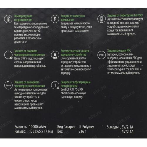 10000 мАч (заявленная производителем ёмкость внутреннего аккумулятора Power Bank; реальная отдаваемая ёмкость Power Bank в пересчете на напряжение 5 В может отличаться в меньшую сторону)