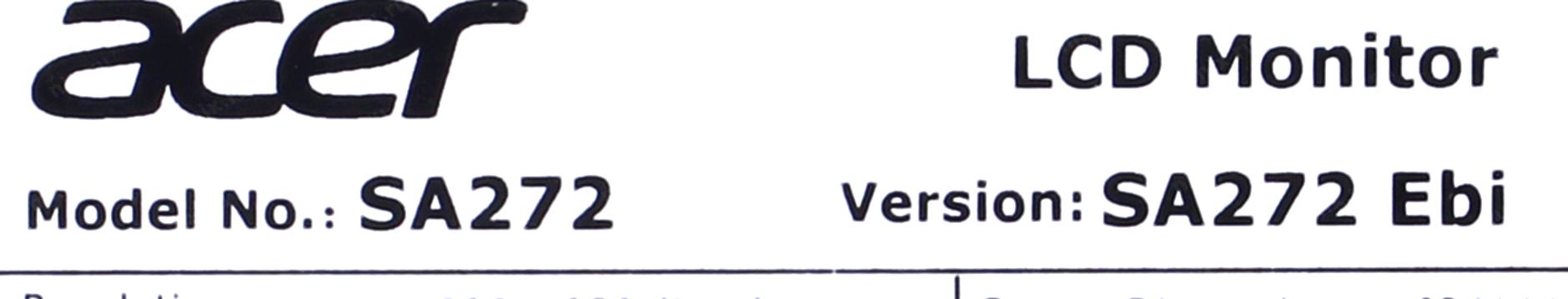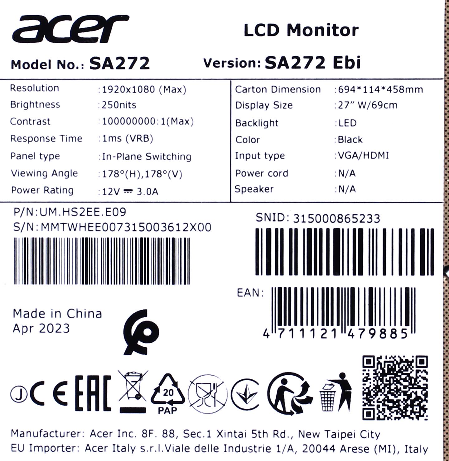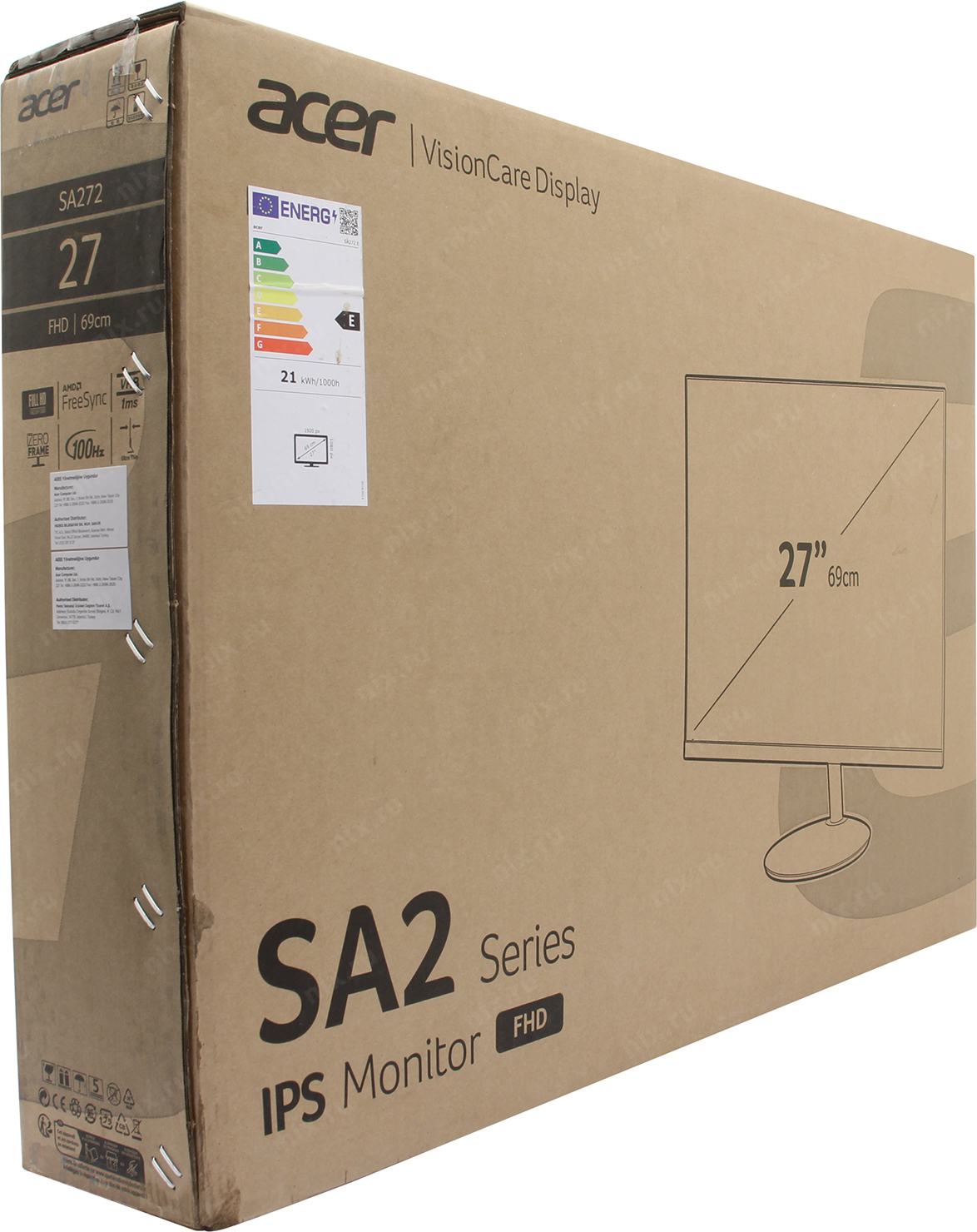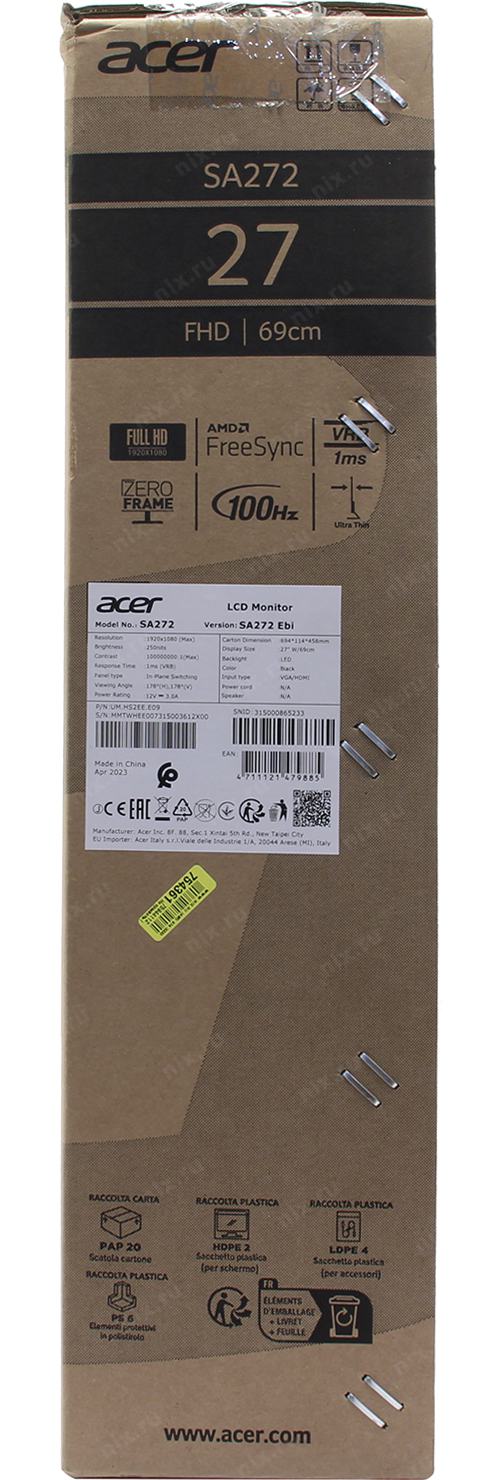Монитор Acer 27" SA272Ebi Black (IPS, 1920x1080, D-sub+HDMI, 4 ms, 178°/178°, 250 cd/m, 1000:1 (100M:1), 100Hz) UM.HS2EE.E09