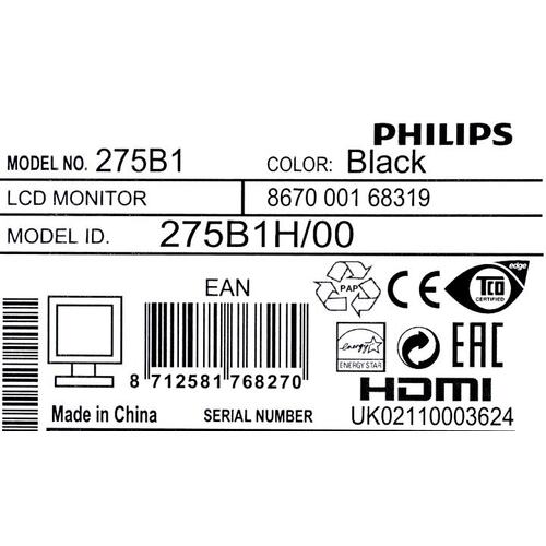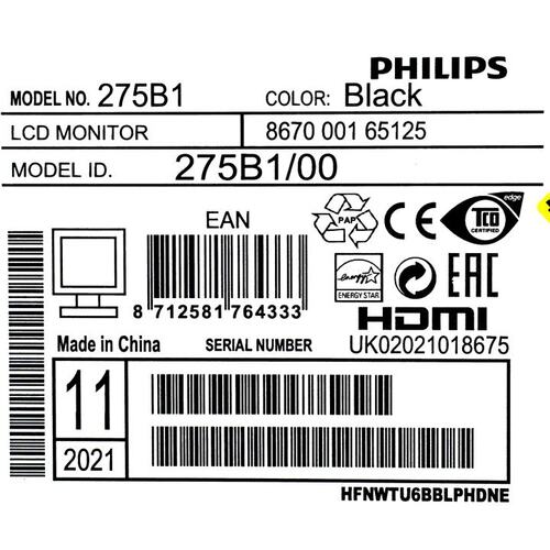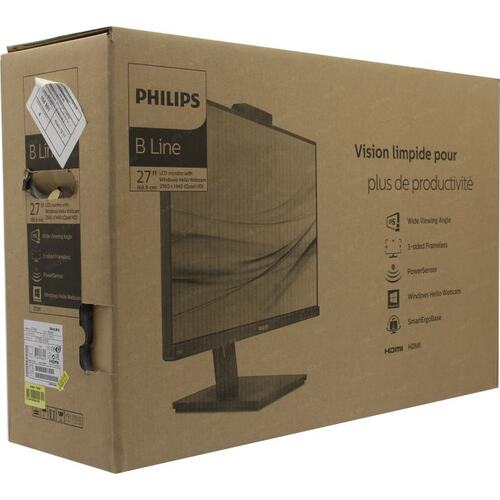 27" Philips 275B1 2560x1440 75Гц IPS W-LED 16: 9 4ms DVI HDMI DP 1xUSB-B/3xUSB 3.2 50M: 1 1000: 1 178/178 300cd HAS Pivot Tilt Swivel Speakers PowerSensor Black (A)