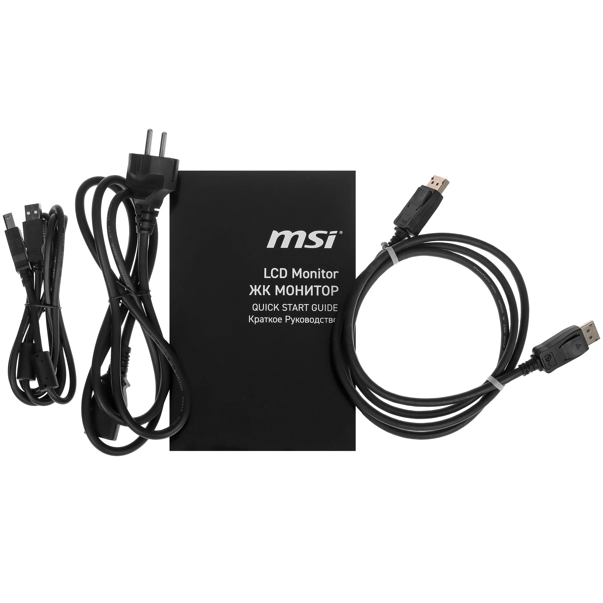 Монитор, документация, кабель DP, кабель питания, 4x винта для подставки, кабель USB Type-B/Type-A