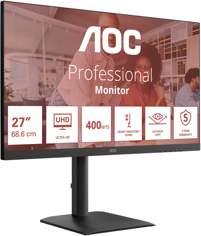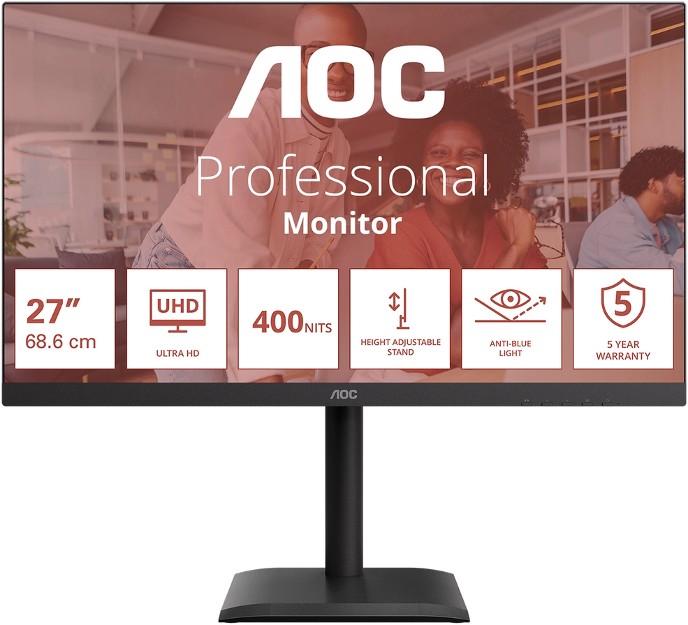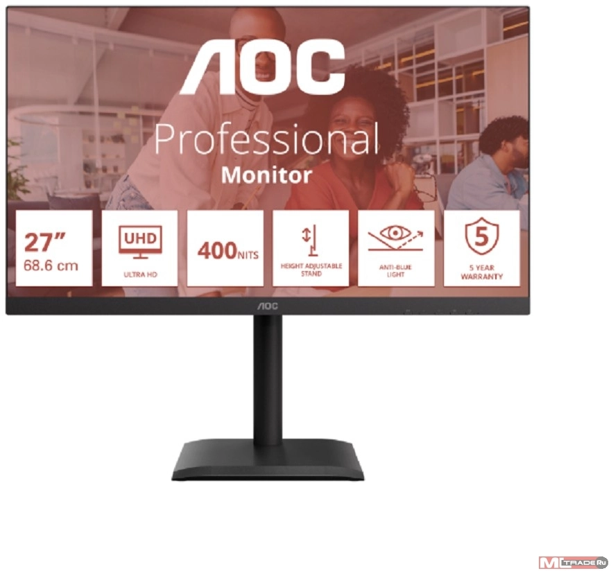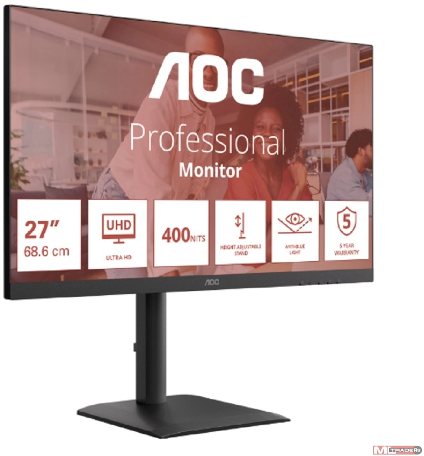 Монитор 27" AOC U27E4CV IPS, 3840x2160, 60Hz, 4ms, 400сd/m, 1200:1 | 2xHDMI(2.1), DP(1.4), Type-C(PD-90W), 4xUSB 3.2, RJ45 | HAS, Pivot, Swivel, InPSU, Speakers, Vesa 100, Black