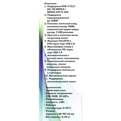 Запись телепередач (PVR);;"Проходной" разъём для антенны;;Потребляемая мощность - 10 Вт;;Функция "Родительский контроль";;Диапазон частот: МВ (174-230 МГц), ДМВ (470-862 МГц)