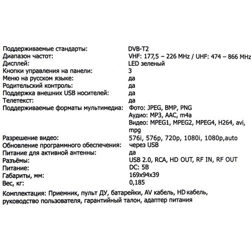 Full HD плеер со встроенным DVB-T/DVB-T2 тюнером, использующий приобретаемые отдельно внешние USB-накопители для хранения данных, с пультом ДУ в комплекте и русским меню.