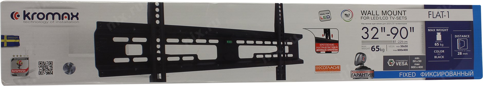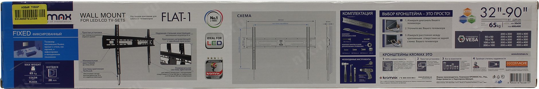 Крепеж Kromax FLAT-1 new black, Кр. стал. наст. для TV 32"-90", max 65 кг, 0 ст св., от ст. 28 мм, max VESA 600x400 мм. [26007]
