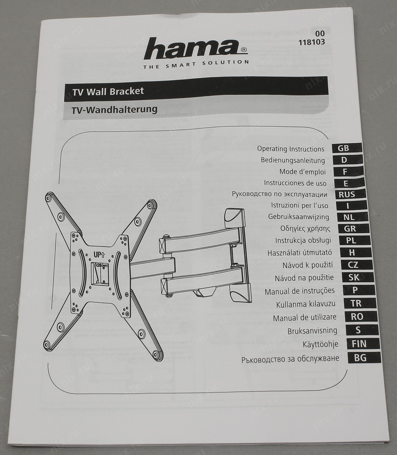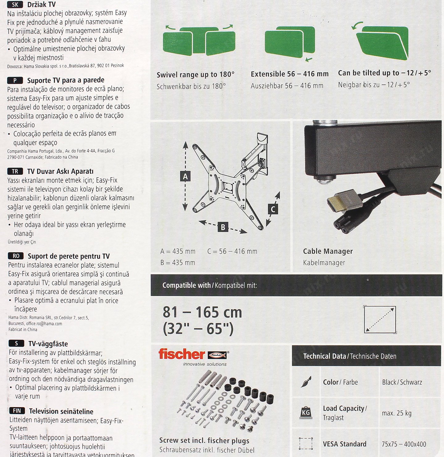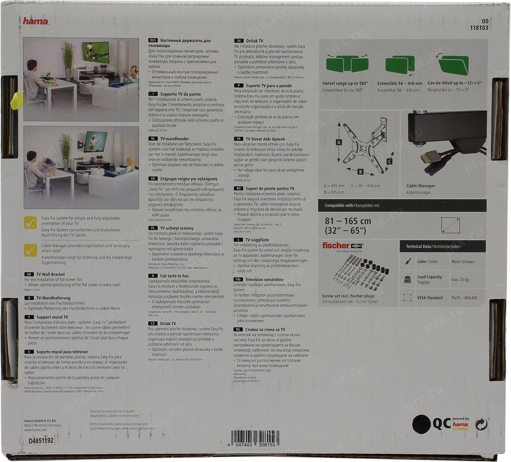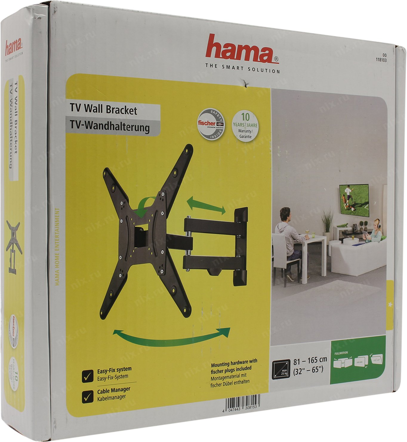 Кронштейн для телевизора Hama H-118103 черный 32"-65" макс.25кг настенный поворот и наклон