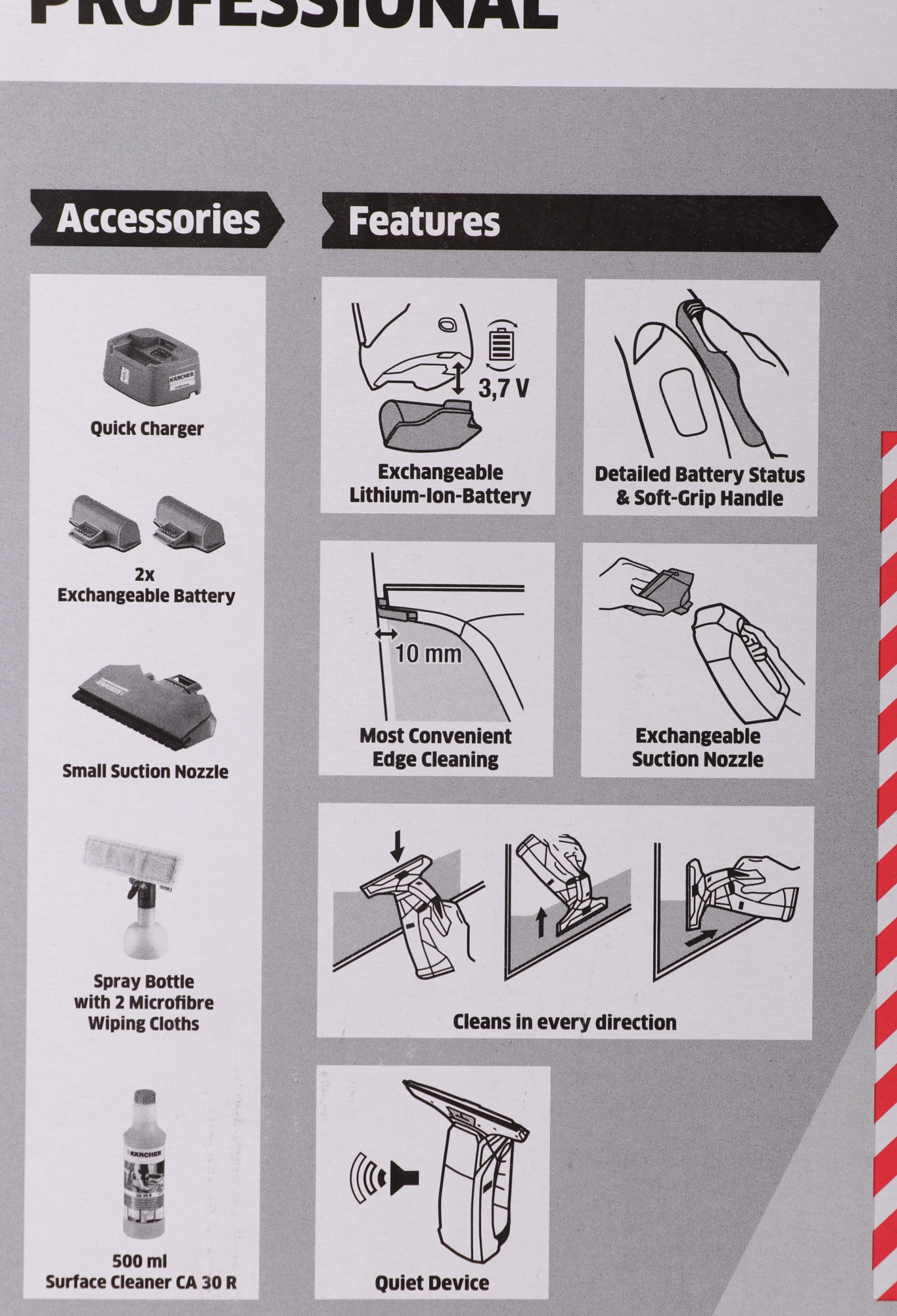 • съемный литий-ионный аккумулятор; • зарядное устройство; • флакон пульверизатор; • всасывающая насадка - 280 мм; • насадка для протирания из микроволокна; • универсальное чистящее средство 0, 5 л.