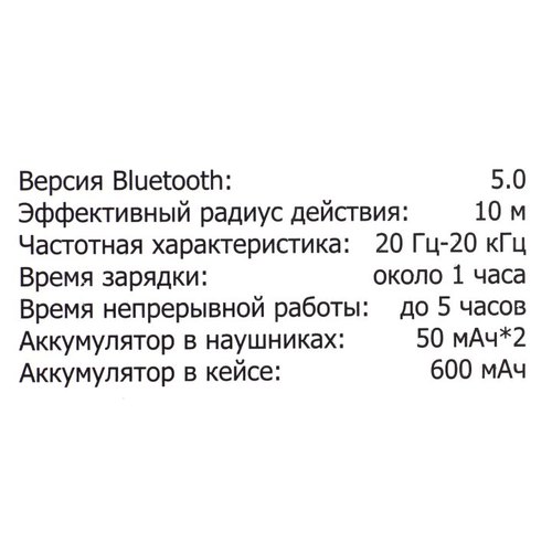 50 мАч - емкость аккумулятора каждого из наушников;;;600 мАч - емкость встроенного в футляр аккумулятора