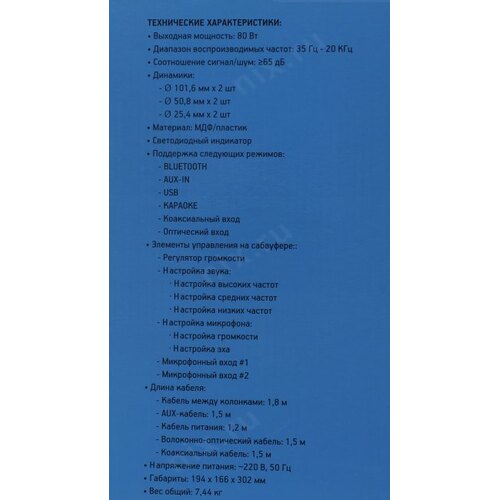 Аудиокабель миниджек - 2xRCA, коаксиальный цифровой аудиокабель, оптический цифровой аудиокабель, кабель питания, пульт ДУ, 2 батарейки типа AAA