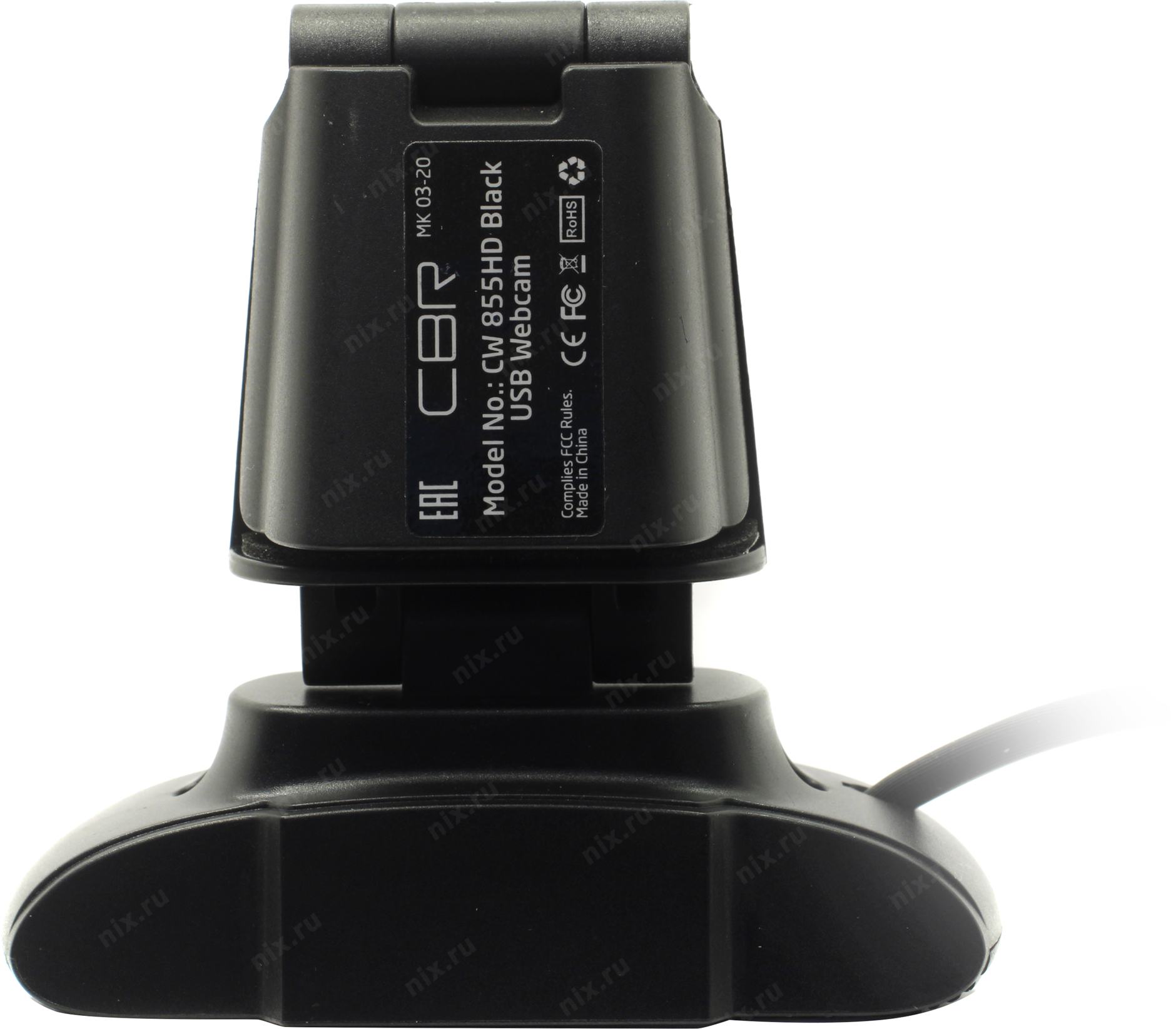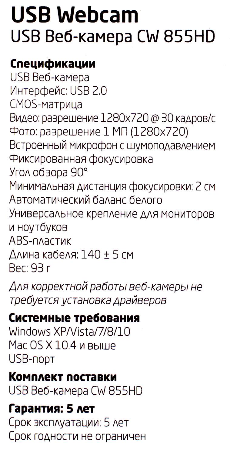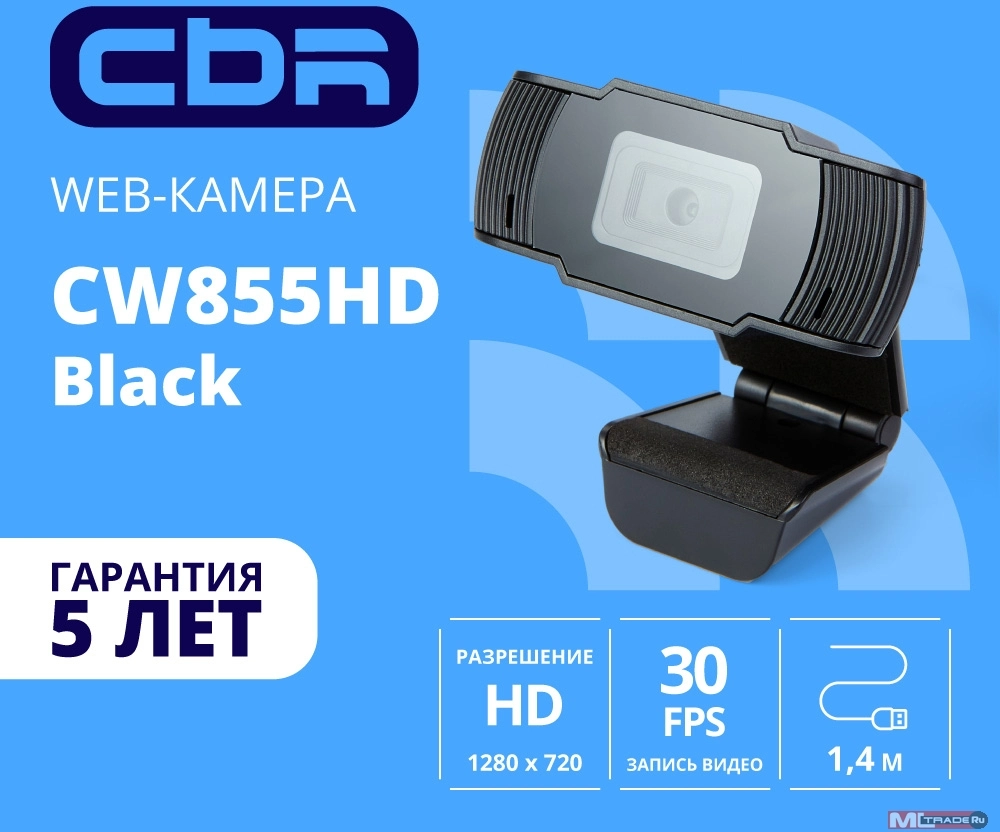 Цифровая камера CBR CW 855HD Black, Веб-камера с матрицей 1 МП, разрешение видео 1280х720, USB 2.0, встроенный микрофон с шумоподавлением, фикс.фокус, крепление на мониторе, длина кабеля 1,4 м, цвет чёрный [CW855HDBlack]