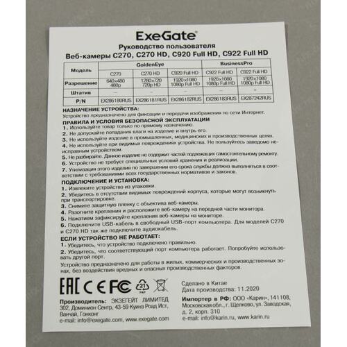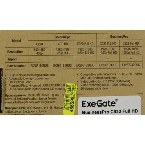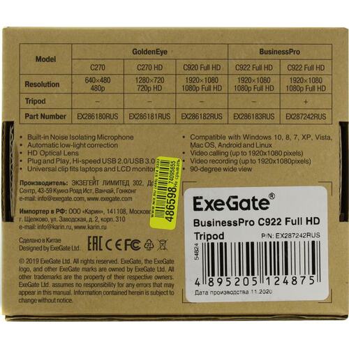 Веб камеры Exegate EX287242RUS Веб-камера ExeGate BusinessPro C922 FullHD Tripod, USB, 1920х1080, микр.с шумоподавл, универс.крепл.[EX287242RUS]