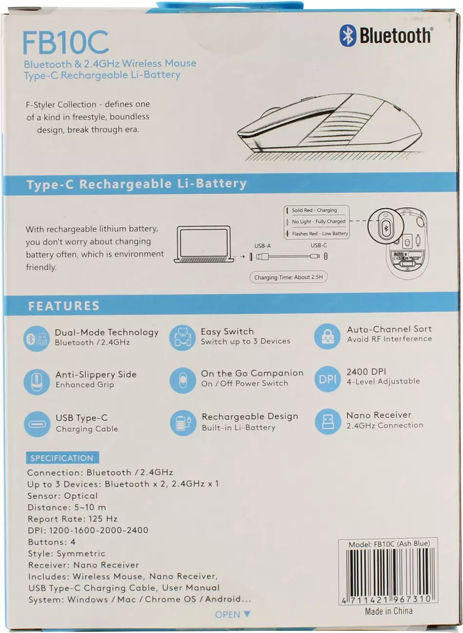 Мышь A4Tech Fstyler FB10C черный/ синий оптическая 2000dpi беспров. BT/ Radio USB 4but (FB10C ASH BLUE) FB10C ASH BLUE