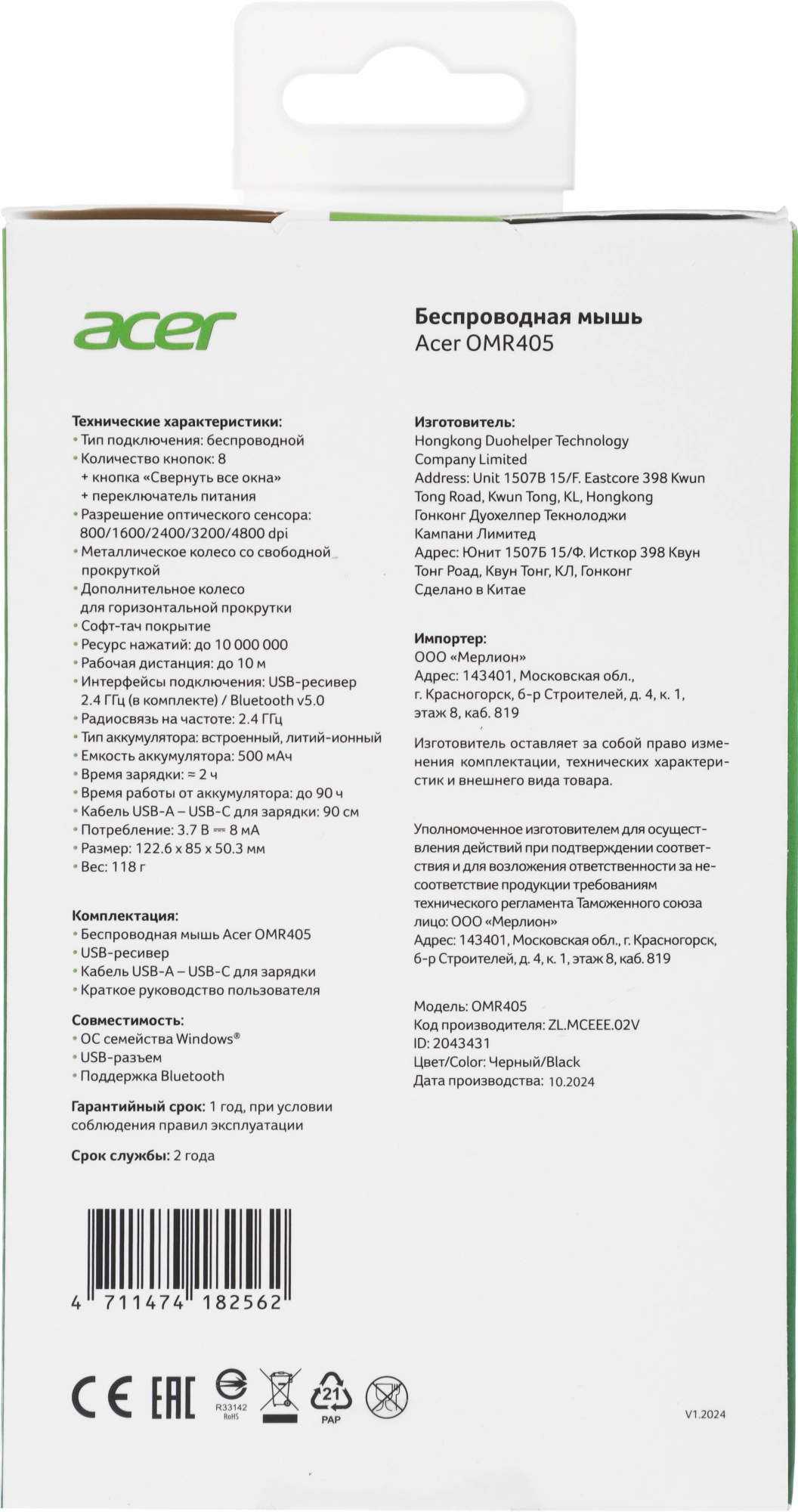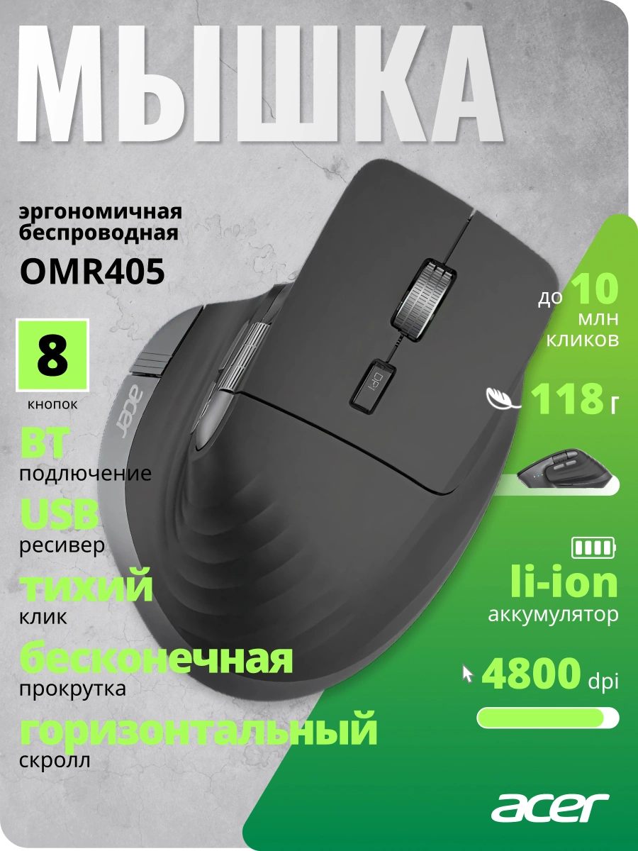 Мышь Acer OMR405 черный оптическая 4800dpi беспров. BT/ Radio USB 9but (ZL.MCEEE.02V)