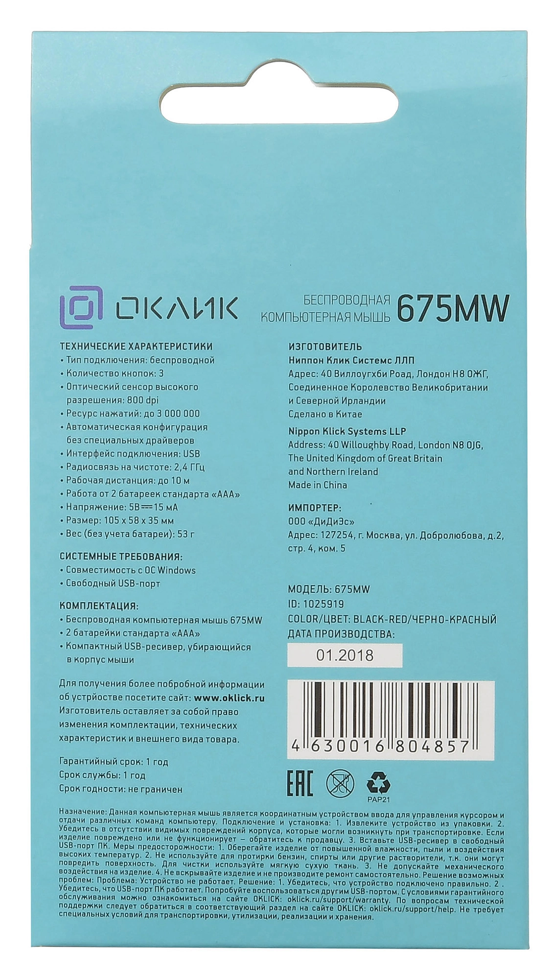 Мышь Оклик 675MW черный/ красный оптическая 1200dpi беспров. USB для ноутбука 3but (1025919) OKLICK