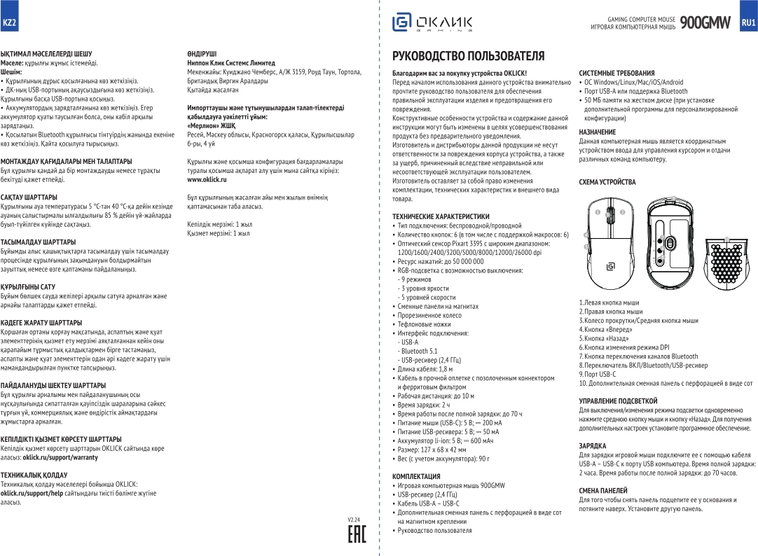 Сенсор PixArt PAW3395. Три режима - 2, 4G + BlueTooth + провод, 600 mAh, 50 млн кликов, RGB. ПО для дополнительной настройки.