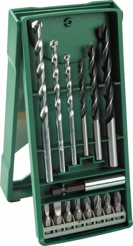 В комплекте: сверла по камню 3 шт. - 5, 6, 8 мм.; сверла по древесине 3 шт. - 4, 6, 8 мм.; биты 25 мм., 8 шт. - PH 1, PH 2, PZ 1, PZ 2, SL 4, SL 8, T 20, T 25; универсальный магнитный держатель 60 мм.