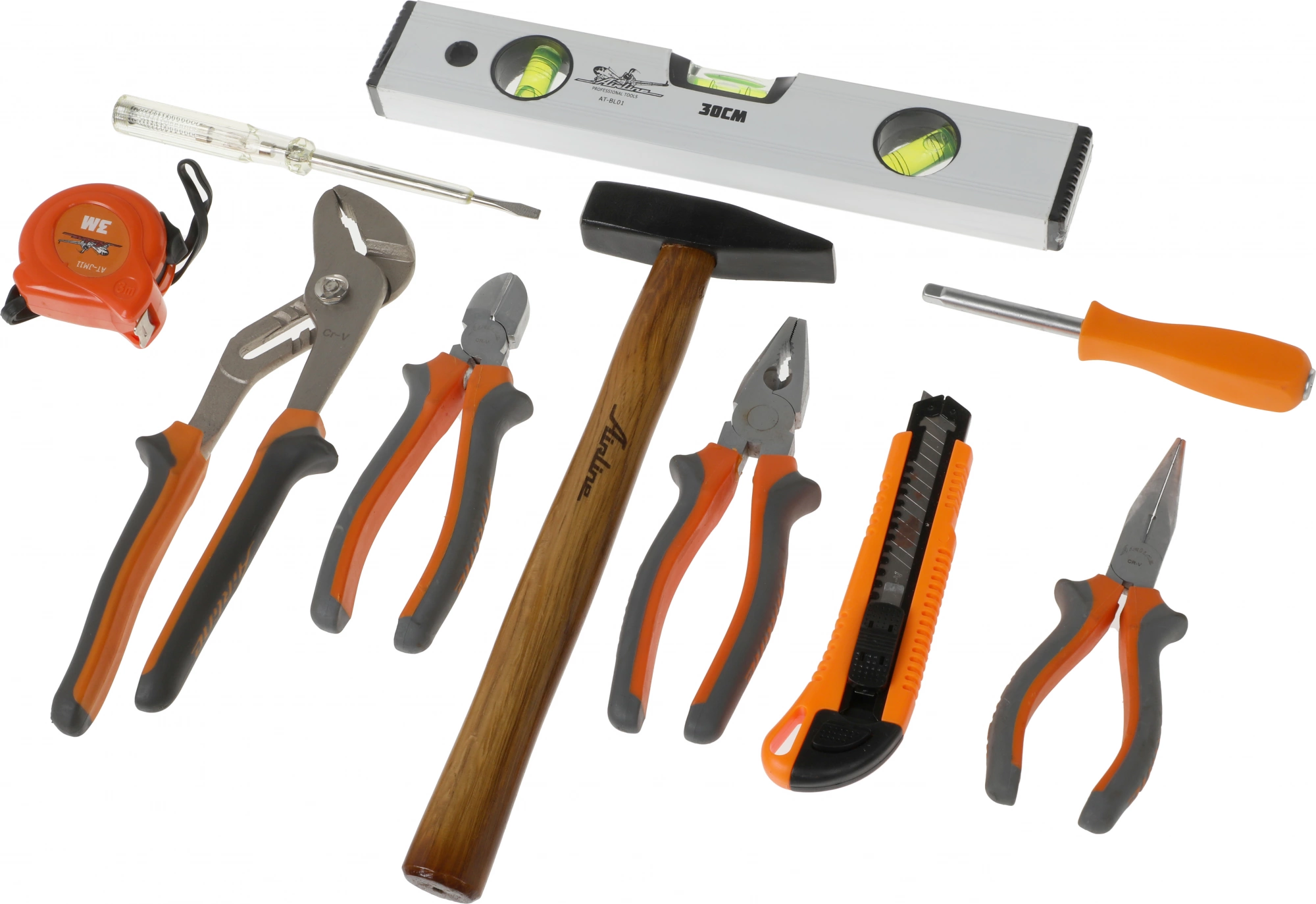 бокорезы, длинногубцы, клещи переставные, молоток, пассатижи, рулетка, уровень
