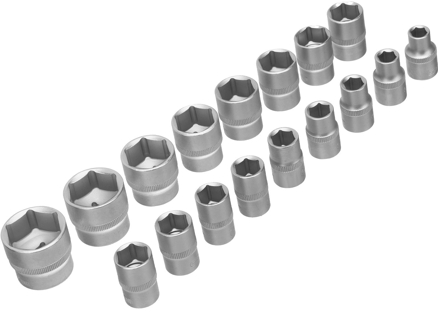 Головки торцевые шестигранные: 10, 11, 12, 13, 14, 15, 16, 17, 18, 19, 20, 21, 22, 24, 27, 30, 32 мм. Головки торцевые удлиненные 11, 15, 17, 19, 22 мм. Головки свечные с резиновый вставкой 16, 21 мм. Головки торцевые, Е: 10, 11. 12, 14. 16, 18, 20, 24 мм