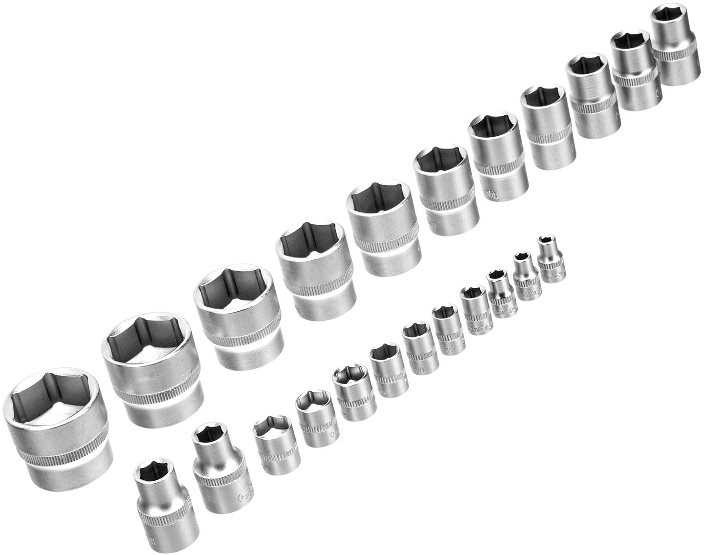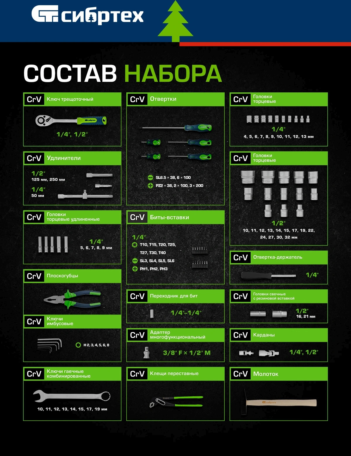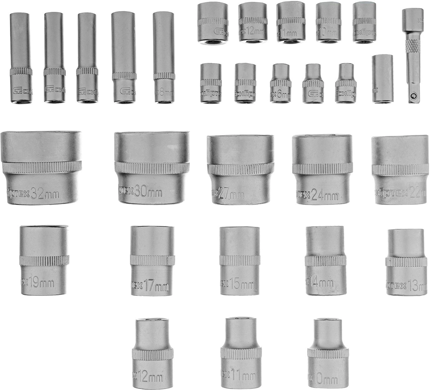 Головки торцевые 10, 11, 12, 13, 14, 15, 17, 19, 22, 24, 27, 30, 32 мм. Головка свечная 16, 21 мм Удлинитель - 125, 250 мм Многофункциональный адаптер, соединяется с удлинителем 3/ 8" F х 1/ 2" М