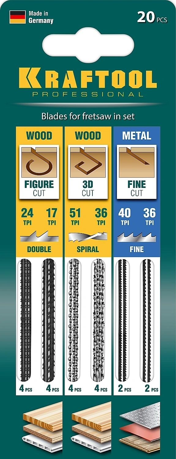 Полотно двойной мелкий зуб, №3 9, 5TPI точный рез - 4 шт. Полотно двойной средний зуб, №5 6, 5 TPI быстрый точный - 4 шт. Полотно спиральный мелкий зуб, № 1 16 TPI выкружной - 4 шт. Полотно спиральный средний зуб, № 3 14 TPI быстрый выкружной - 4 шт.