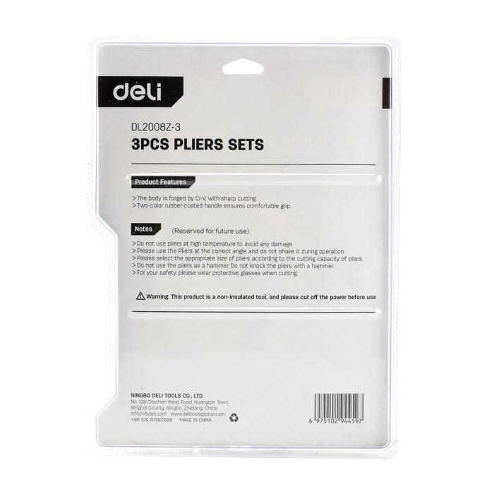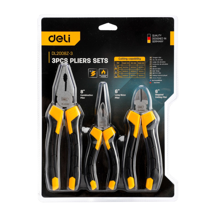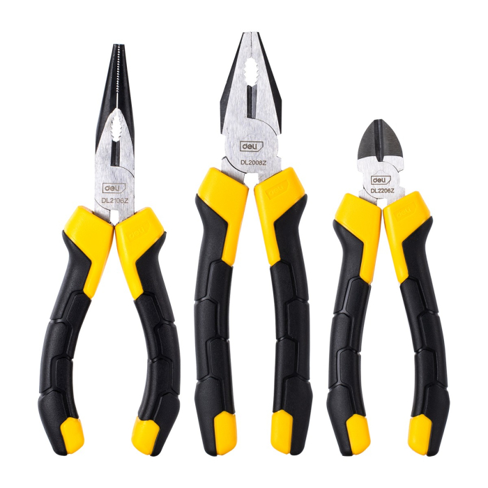Набор плоскогубцев Deli DL2008Z-3 200мм комбинированные плоскогубцы, 170мм длинногубцы, 170мм бокорезы, сталь Cr-V, двухкомпонентная прорезиненная рукоятка