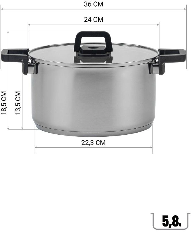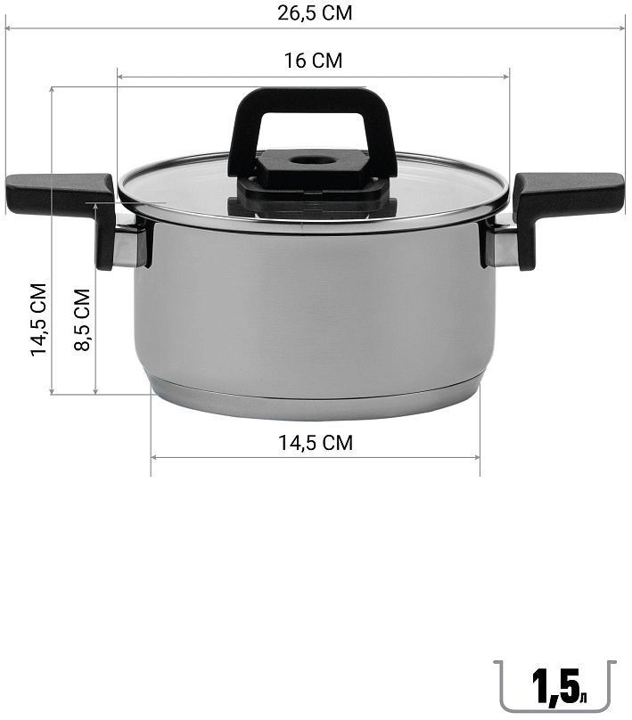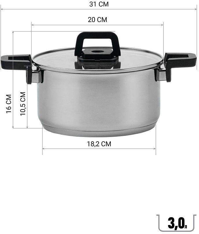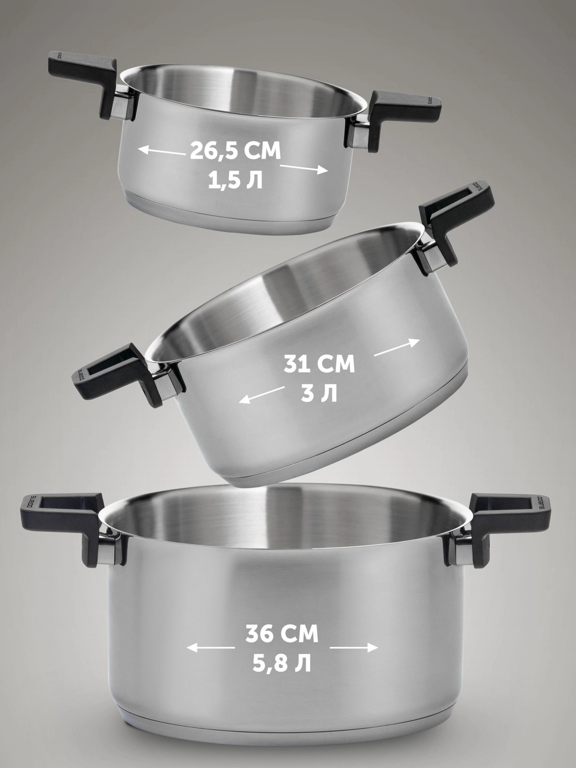 Набор изготовлен из высококачественной нержавеющей стали 18/10. Состав набора: Кастрюля с крышкой 16 см - 1,5 л, Кастрюля с крышкой 20 см - 3 л, Кастрюля с крышкой 24 см - 5,8 л