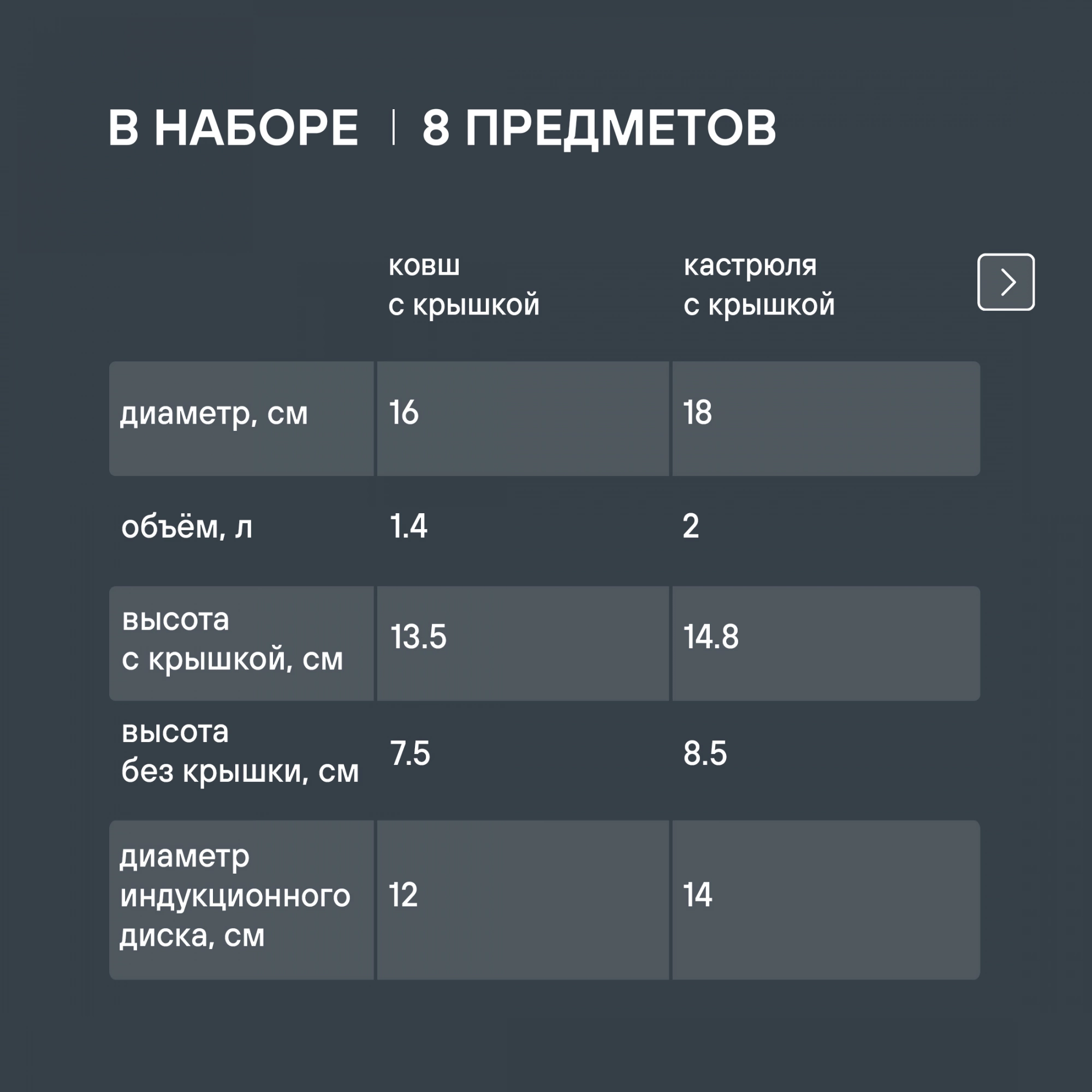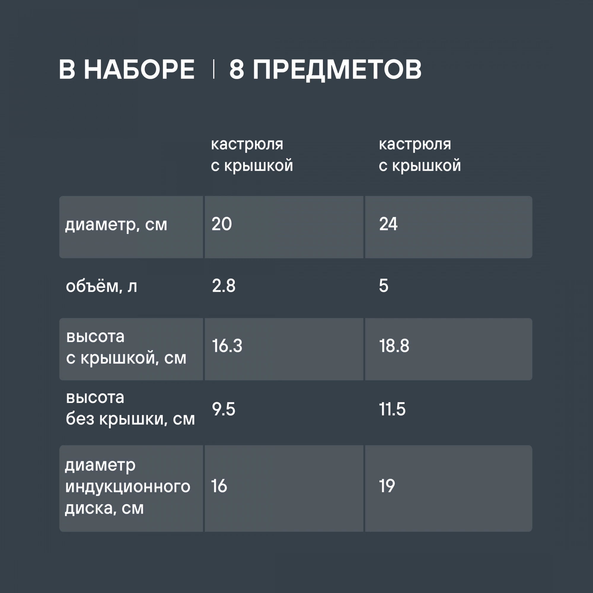 Кастрюли с крышками 18 см (2 л), 20 см (2,8 л), 24 см (5 л), ковш с крышкой 16 см (1,4 л)