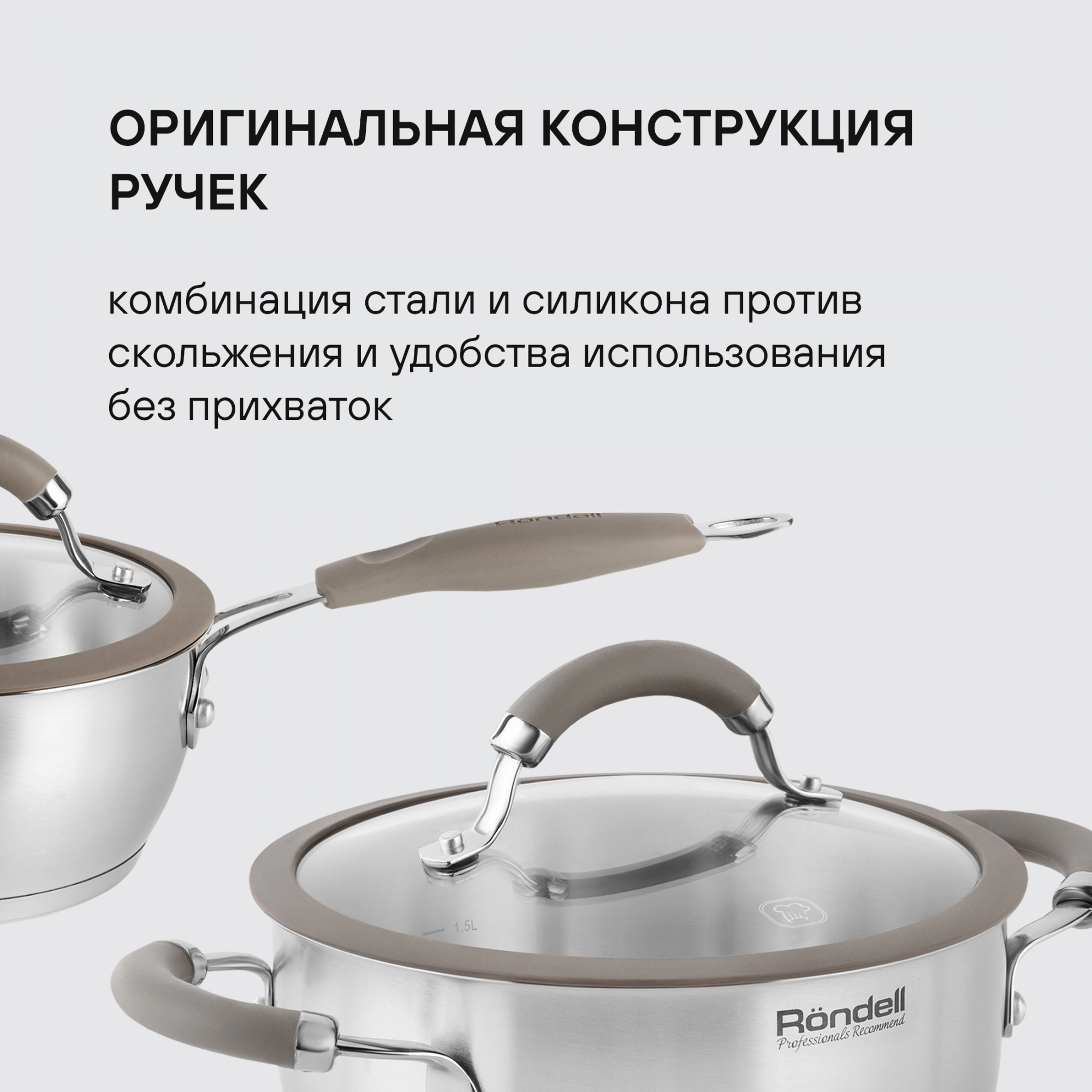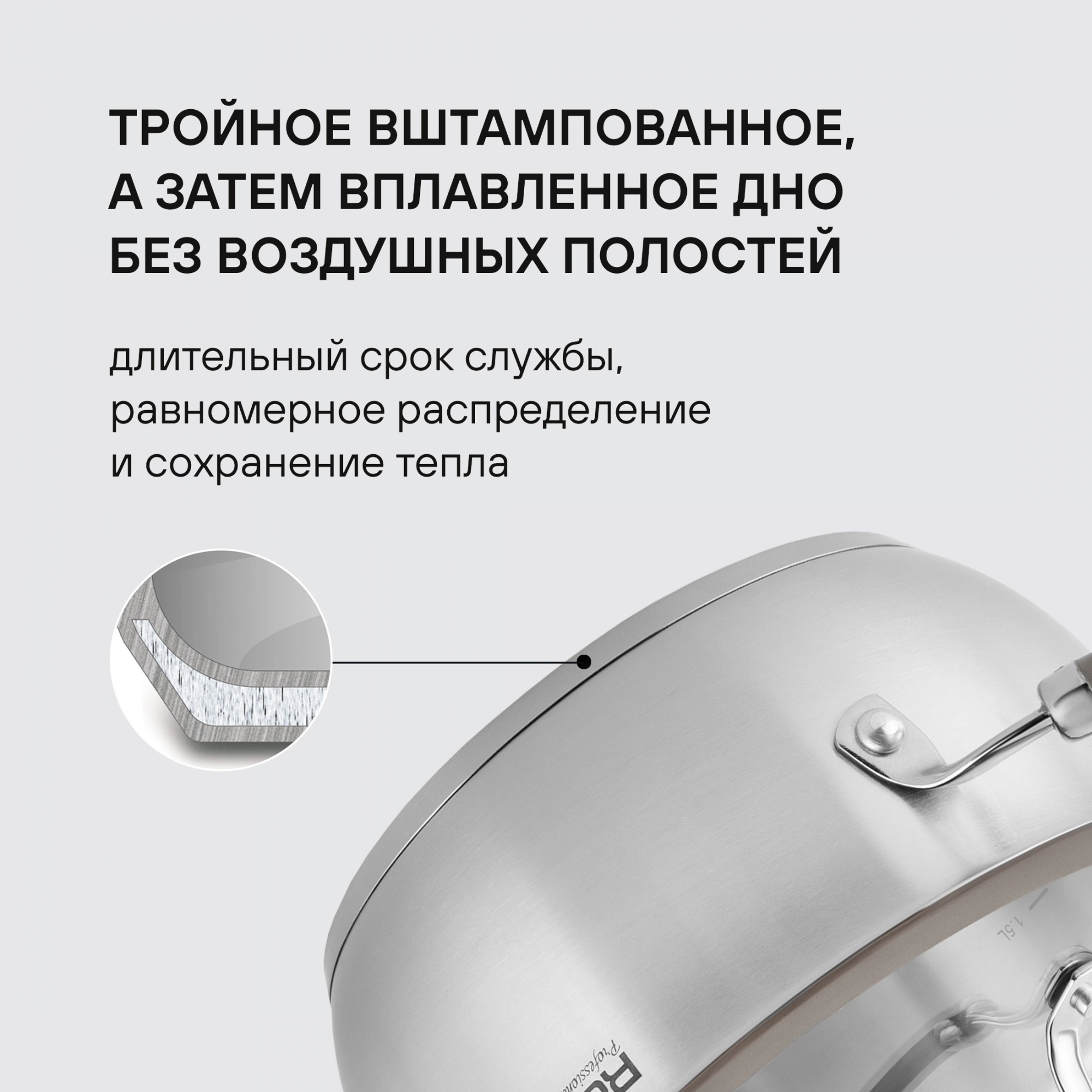 Материал: нержавеющая сталь 18/10. Технология: силиконовый обод позволяет крышке закрываться бесшумно, предотвращает сколы при падении. Внутреннее покрытие: без покрытия. Оригинальная конструкция ручек - комбинация стали и силикона. Преимущества: ободок крышки из силикона против сколов и трещин.