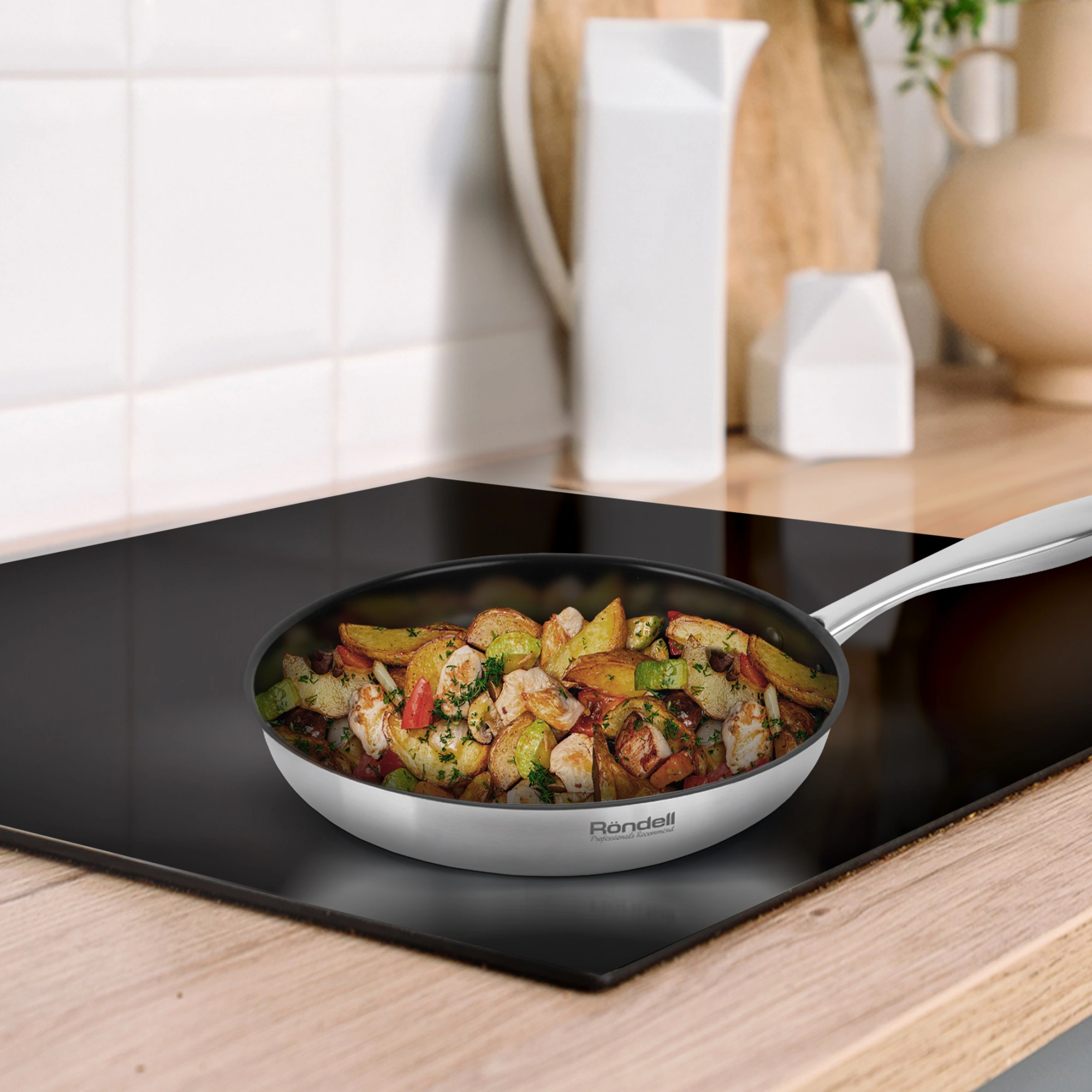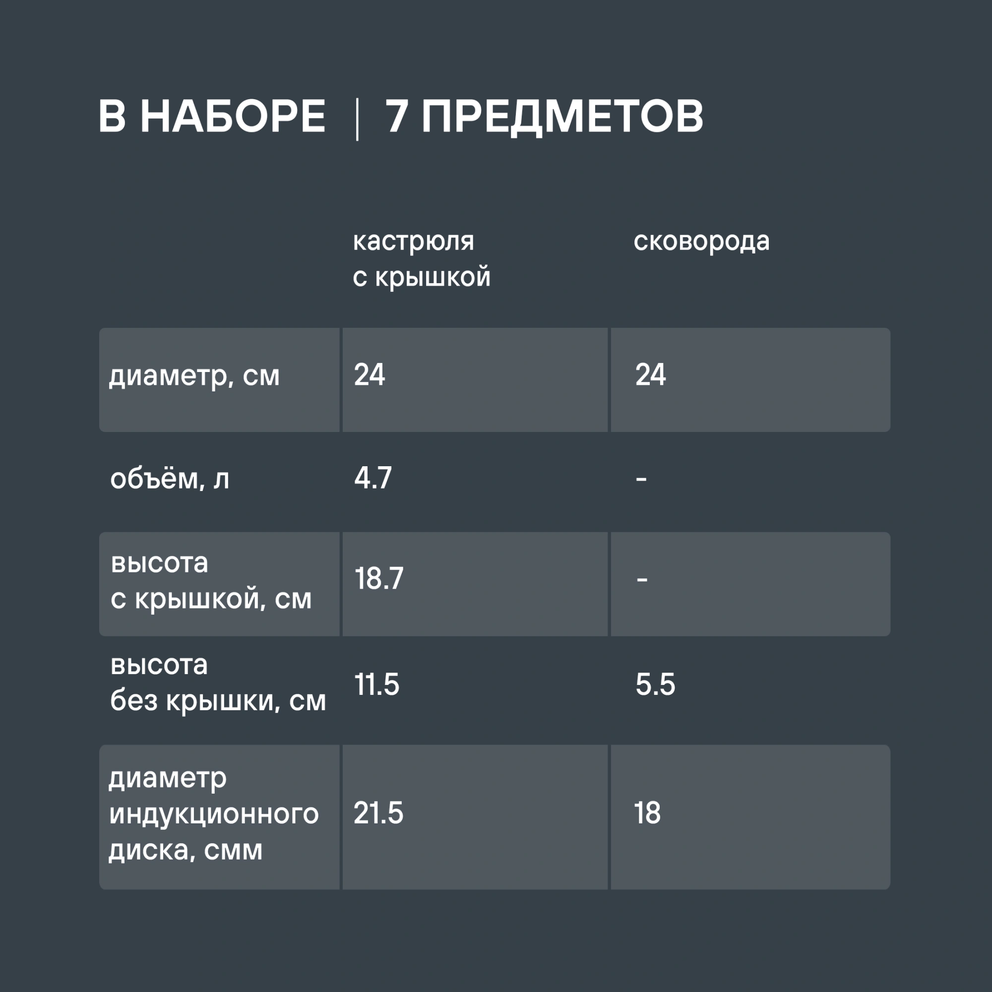 Материал: нержавеющая сталь 18/ 10. Преимущества: крышка из термостойкого стекла с с двумя размерами отверстий для удобного слива жидкости. Внутреннее покрытие: SilkWare® – двухслойное антипригарное покрытие для интенсивного использования (для сковороды) . Толщина стенок: 0, 5 мм, дна: 5, 0 мм.