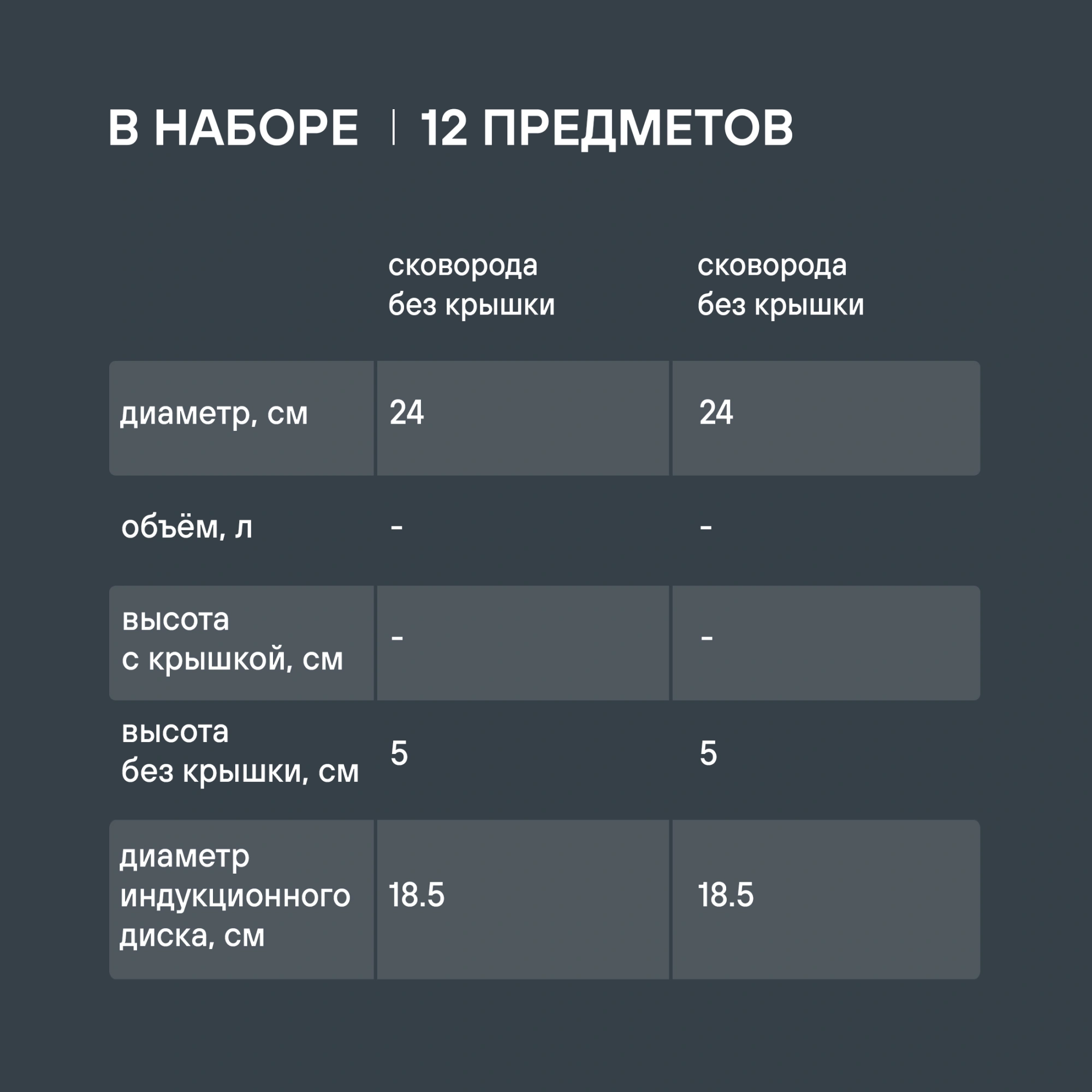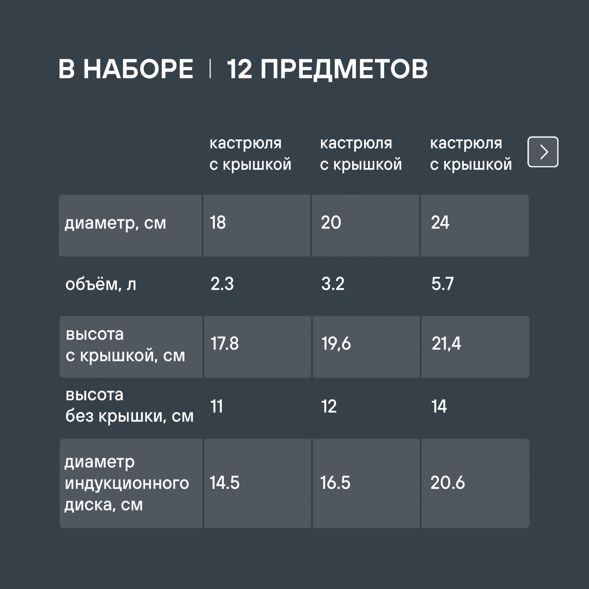 Кастрюля с крышкой 18 см (2,3 л) , кастрюля с крышкой 20 см (3,2 л) , кастрюля с крышкой 24 см (5,7 л), ковш с крышкой 14 см (1,0 л) , ковш с крышкой 16 см (1,3 л), сковорода с а/п , сковорода без а/п