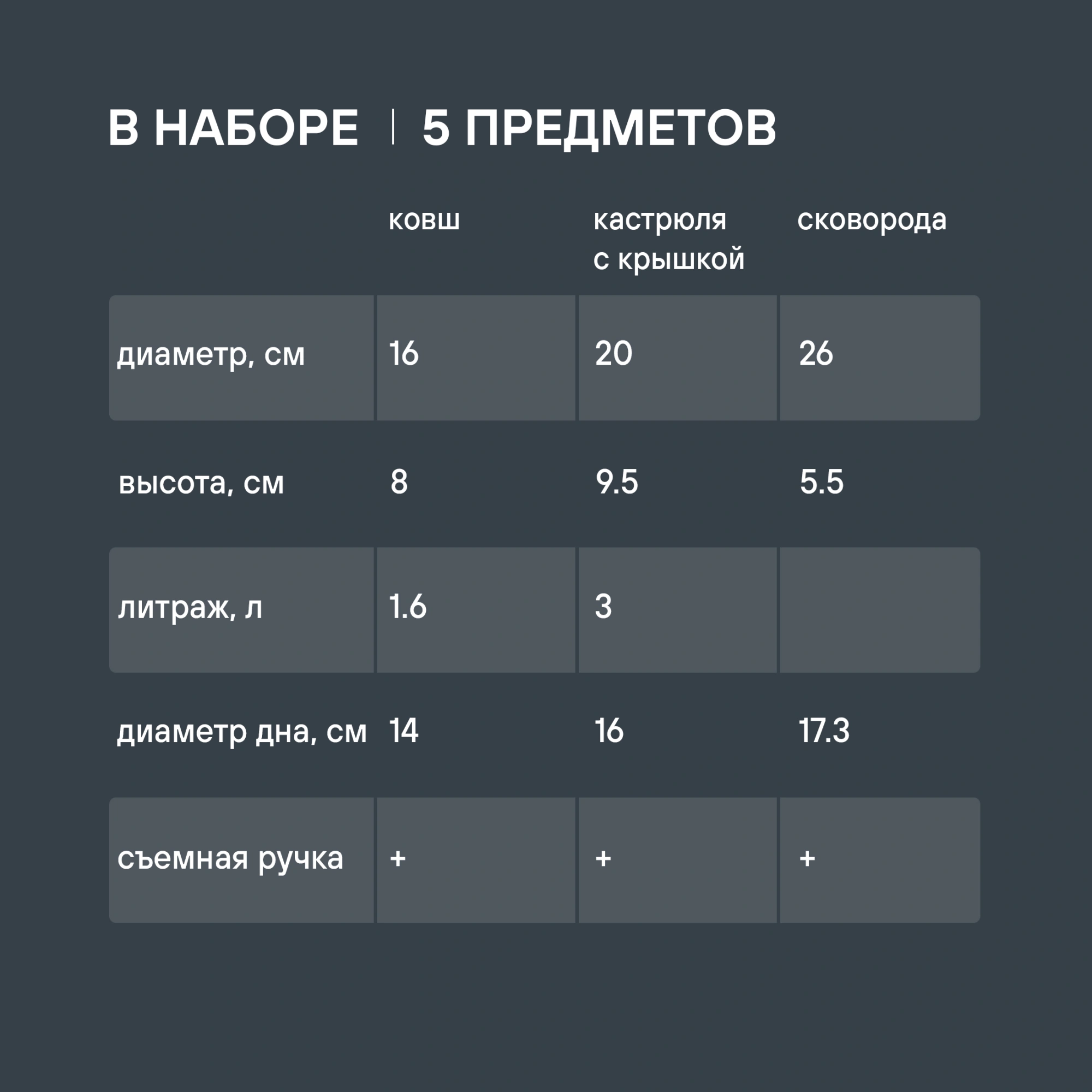 Ковш 16х8см (1,6л) , кастрюля с крышкой 20х9,5см (3л), сковорода 26х5,5см , съемная ручка
