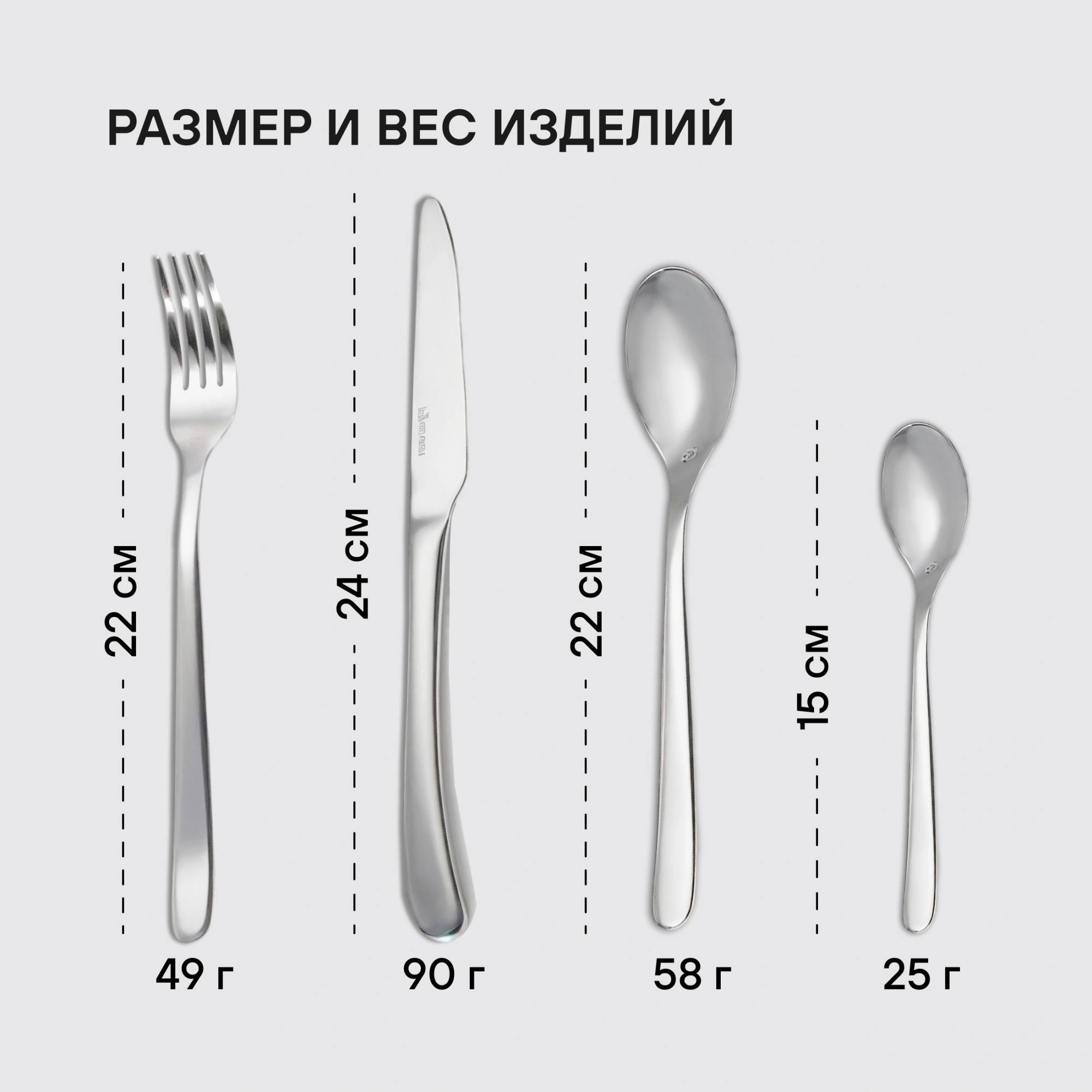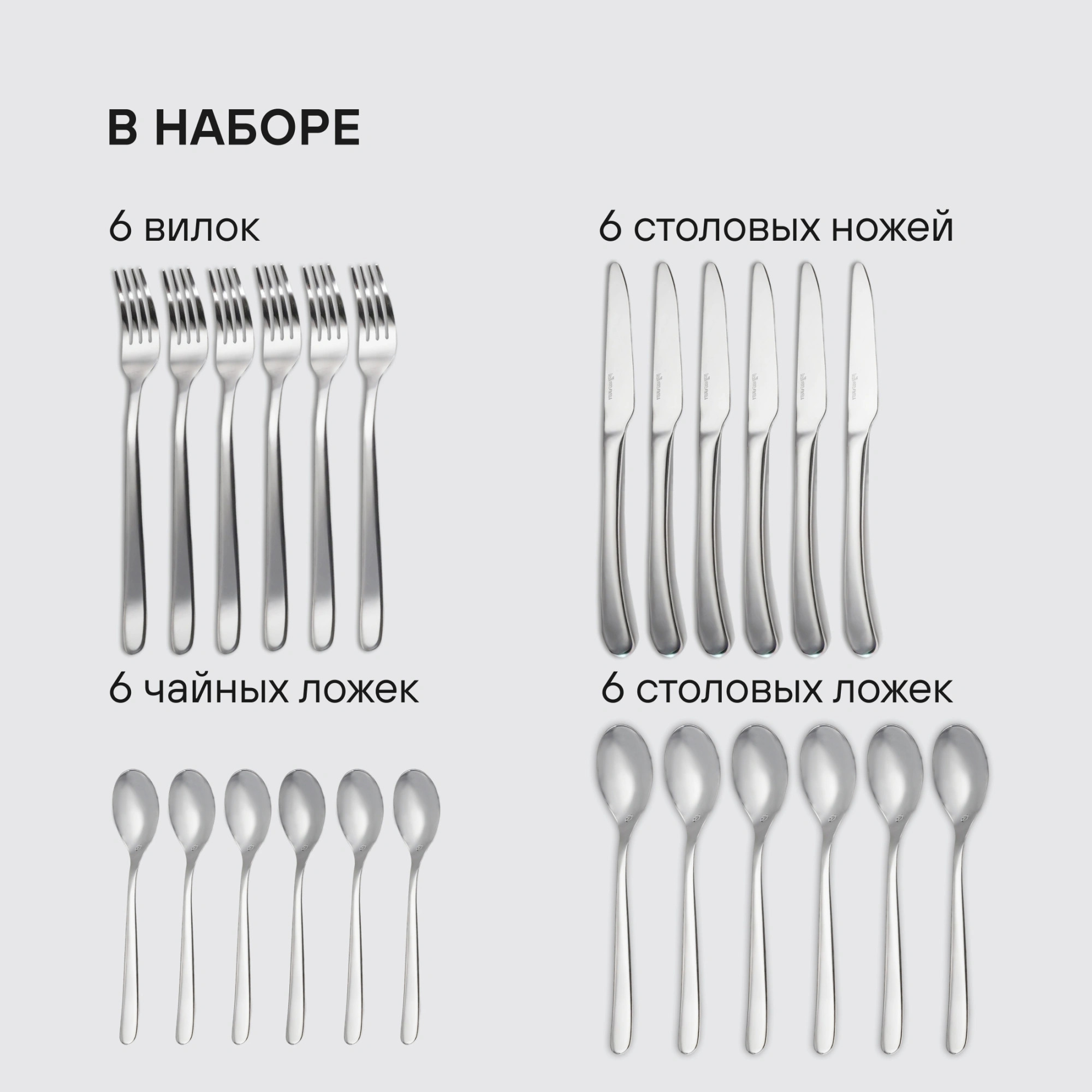 шесть вилок, шесть столовых ложек, шесть ножей и шесть чайных ложек